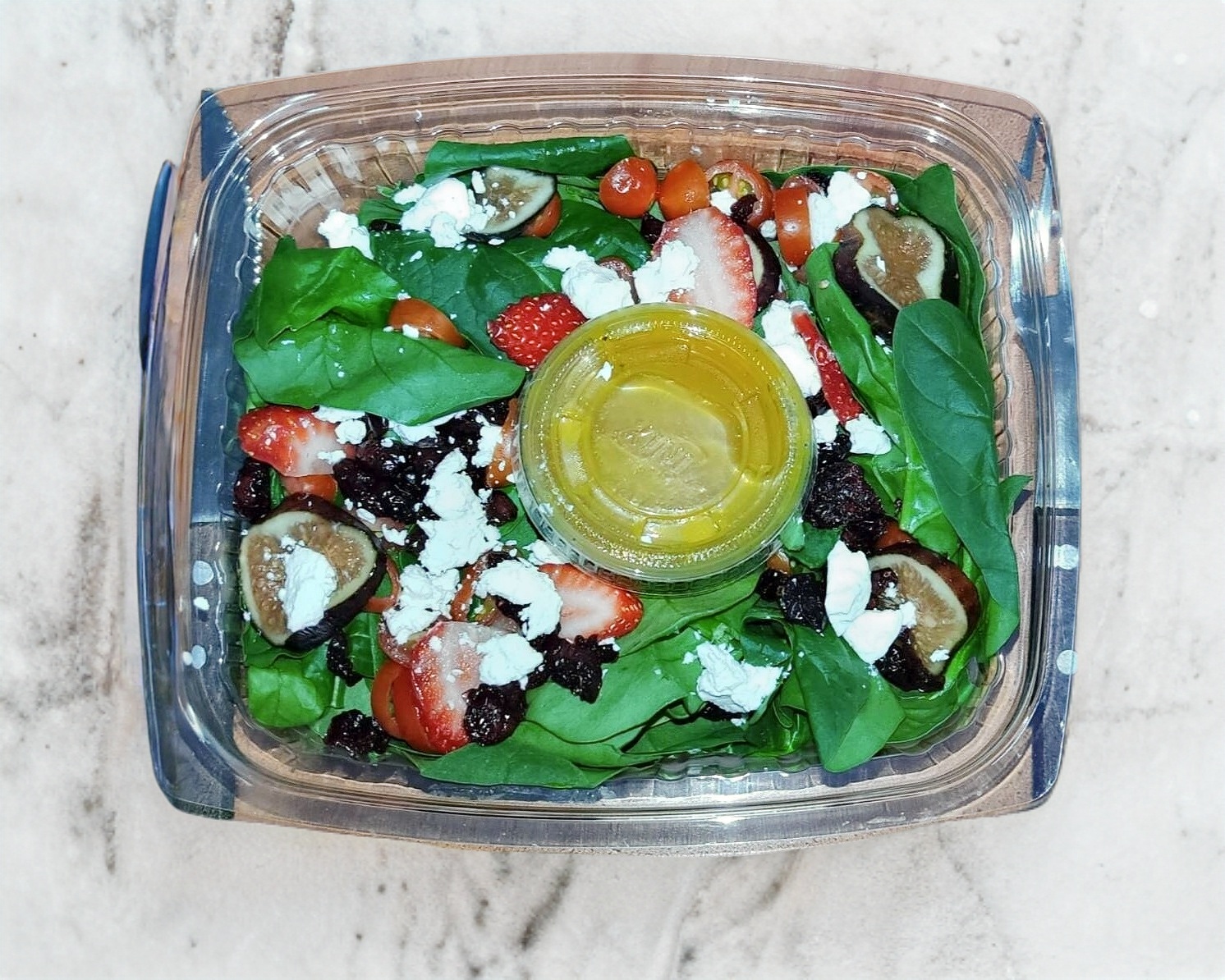 Espinaca, Fresa, Cherry, Higo, Queso de Cabra, Arandano, Porcion 250g, Acompañada con Vinagreta Italiana. Elige tu proteina Favorita con costo Extra.