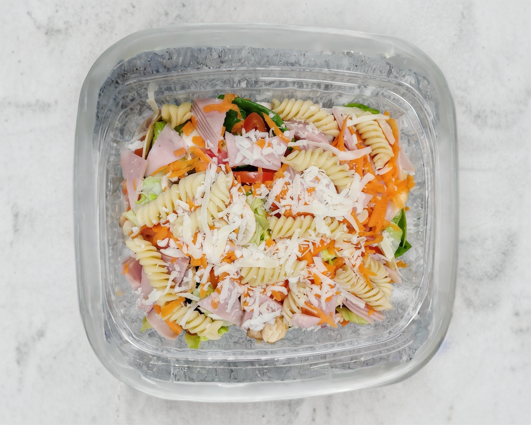 Ensalada con Lechuga, Espinaca, Cherry, Champiñones, Zanahoria, Queso Parmesano, Jamon y Pasta Fusilli Porcion 250g. Incluye Ranch