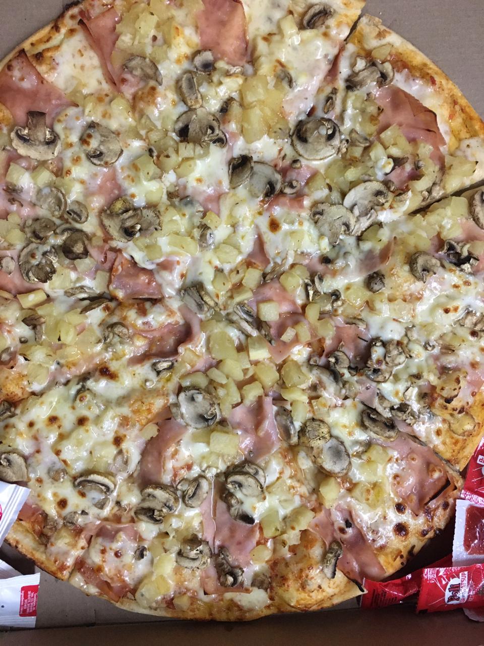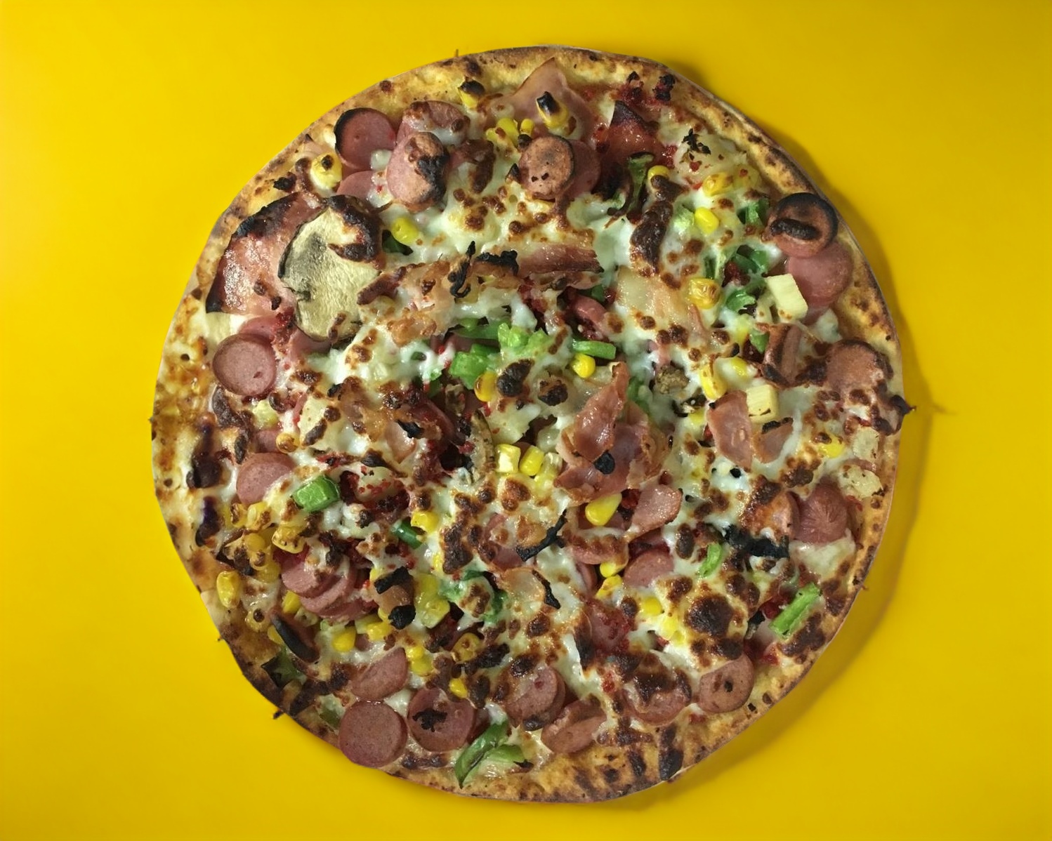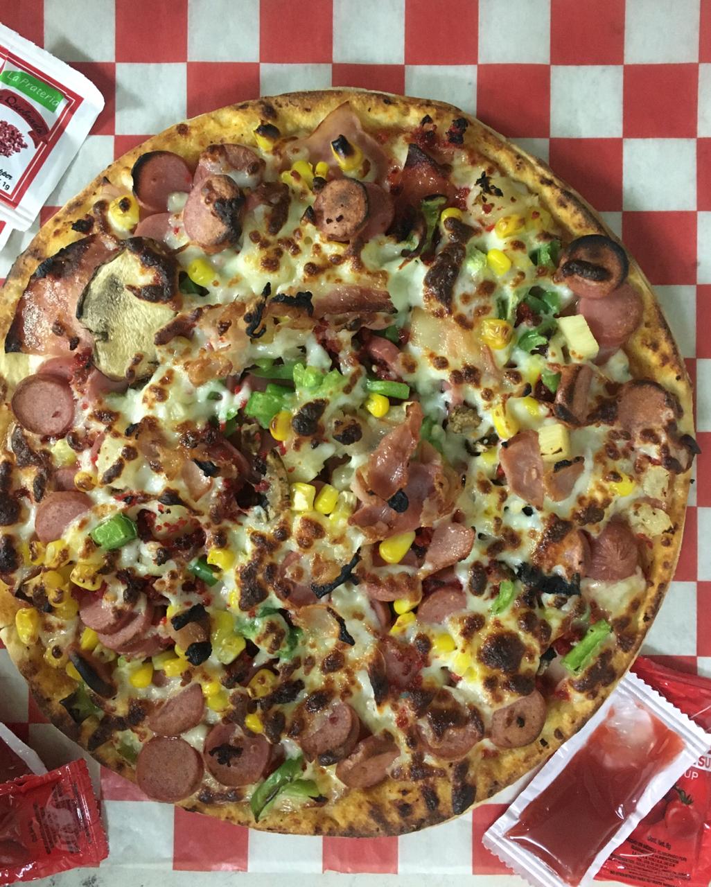 Jamón, salami, salchicha, peperoni, tocino, chorizo, elote, piña, champiñon y pimiento.