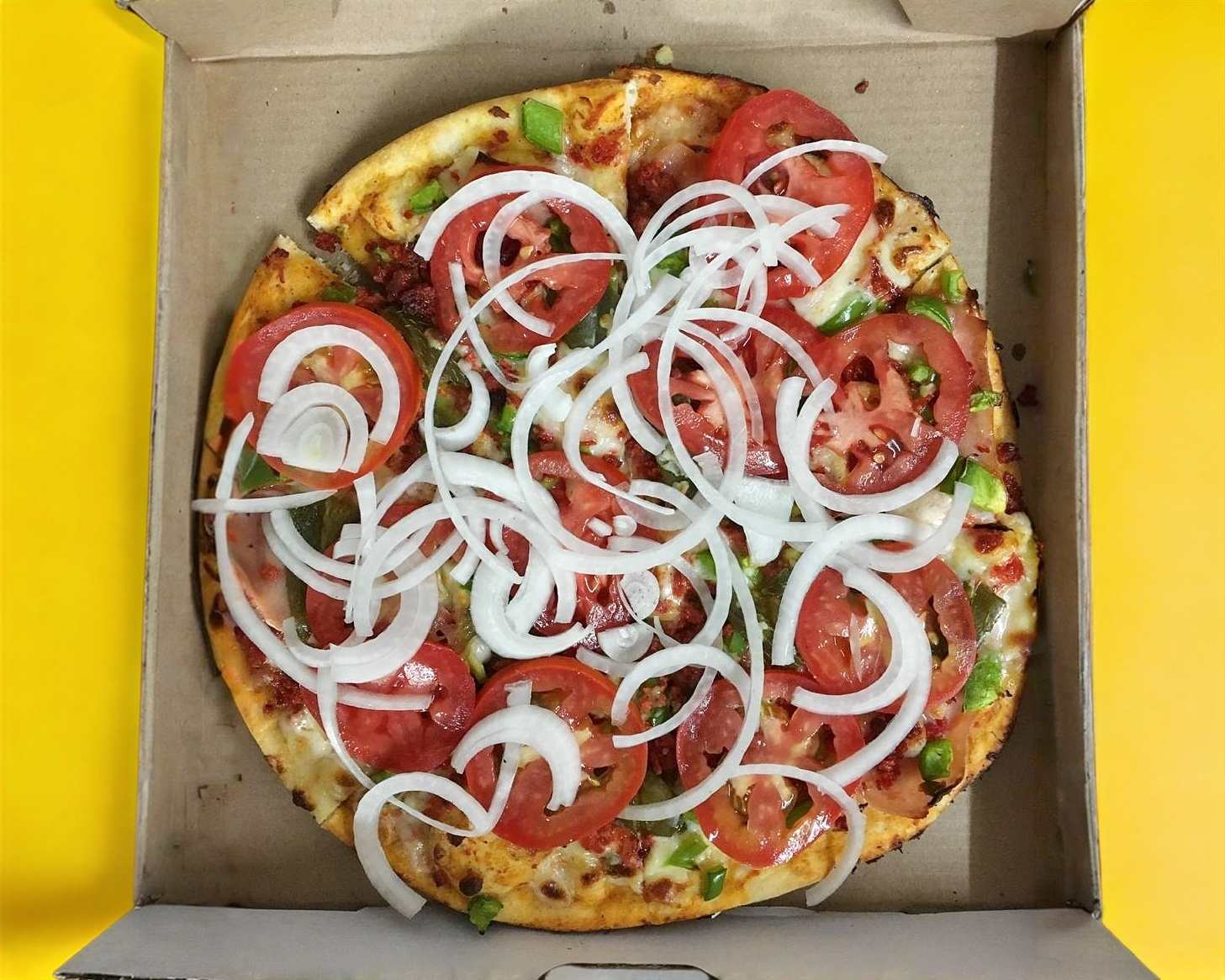 Jamón, chorizo, pimiento, jitomate, cebolla y jalapeño.