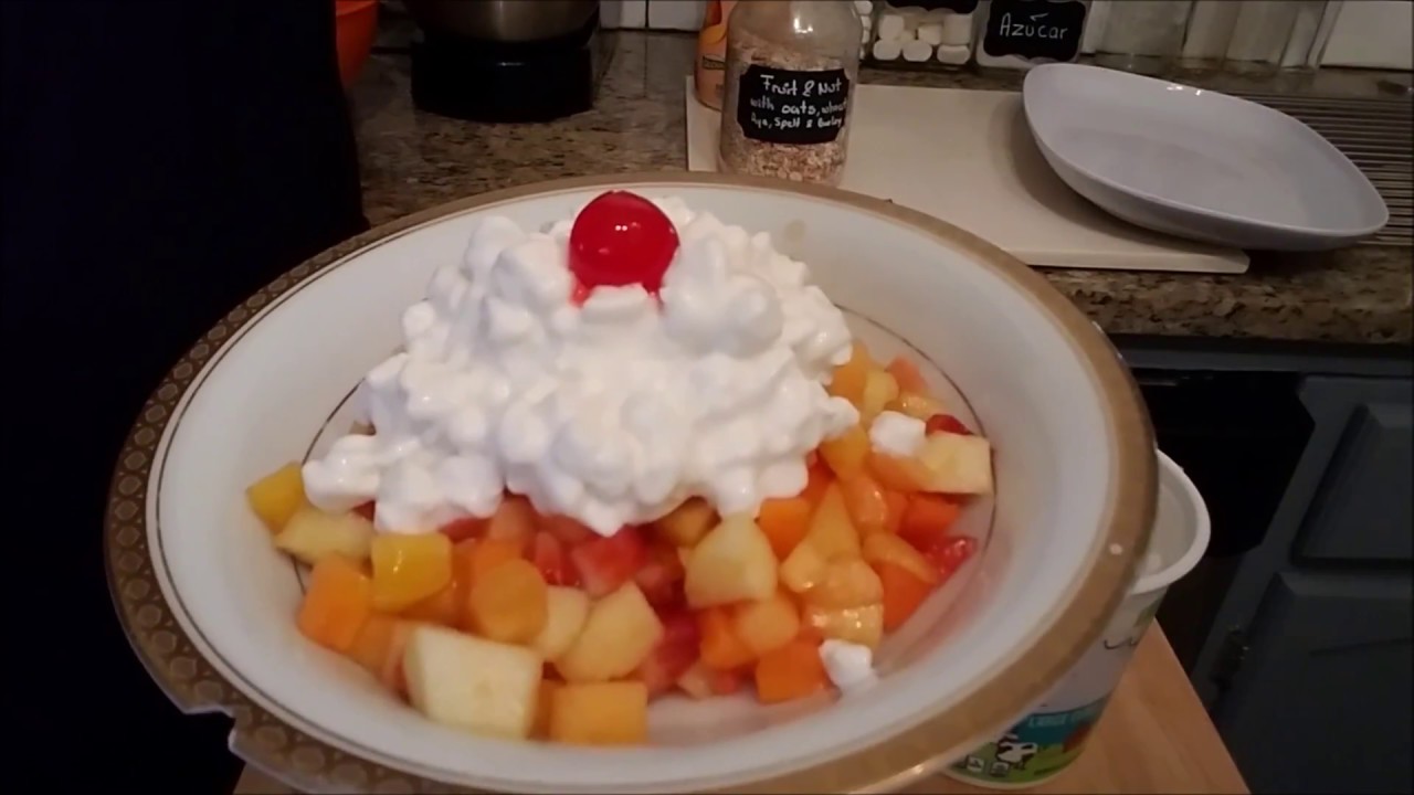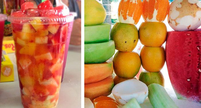 Papaya, melón, sandia, guayaba, manzana, jugo de naranja, sal y limón.