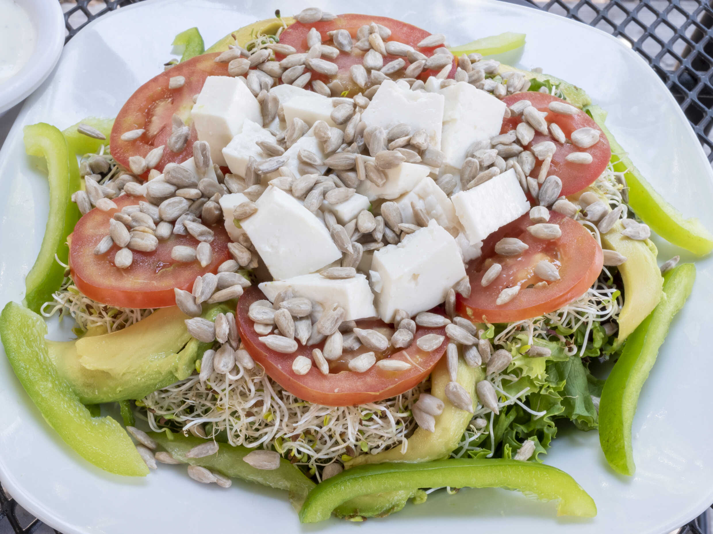Lechugas mixtas, germinado, jitomate, aguacate, pimiento, panela, semillas de girasol y aderezos.