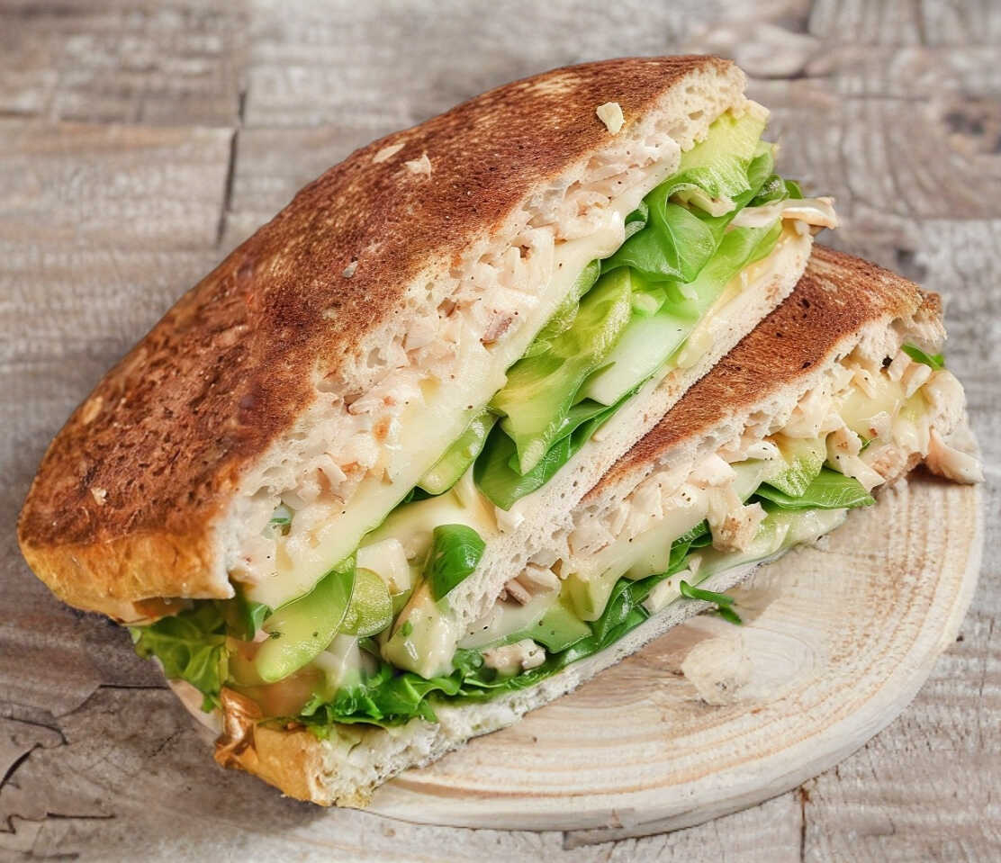 Lechuga, jitomate, cebolla, aguacate, zanahoria rallada, jalapeño, aderezo de crema y mostaza, a elegir atún, panela o pollo.