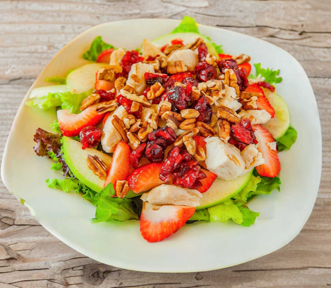 Lechugas mixtas, manzana verde, fruta de temporada, nuez, arándano,pollo y vinagreta italiana