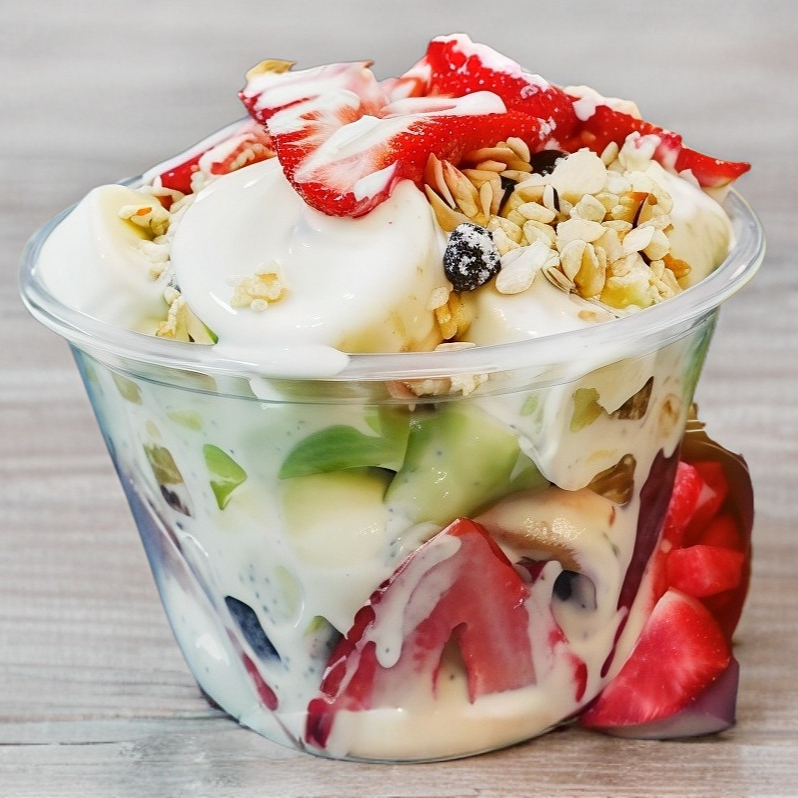 Fresa, plátano, melón, manzana, papaya y crema dulce.