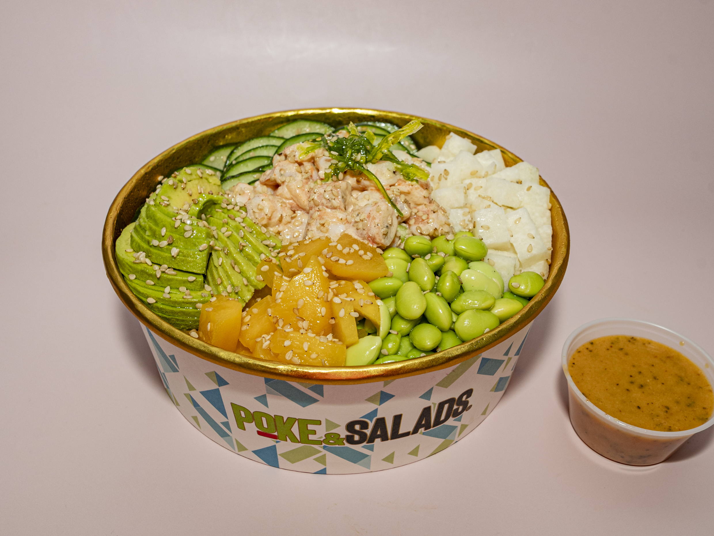 Arroz, alga wakame , aguacate, pepino, frijol edamame, Jicama, durazno, camarón, aderezos mil islas.