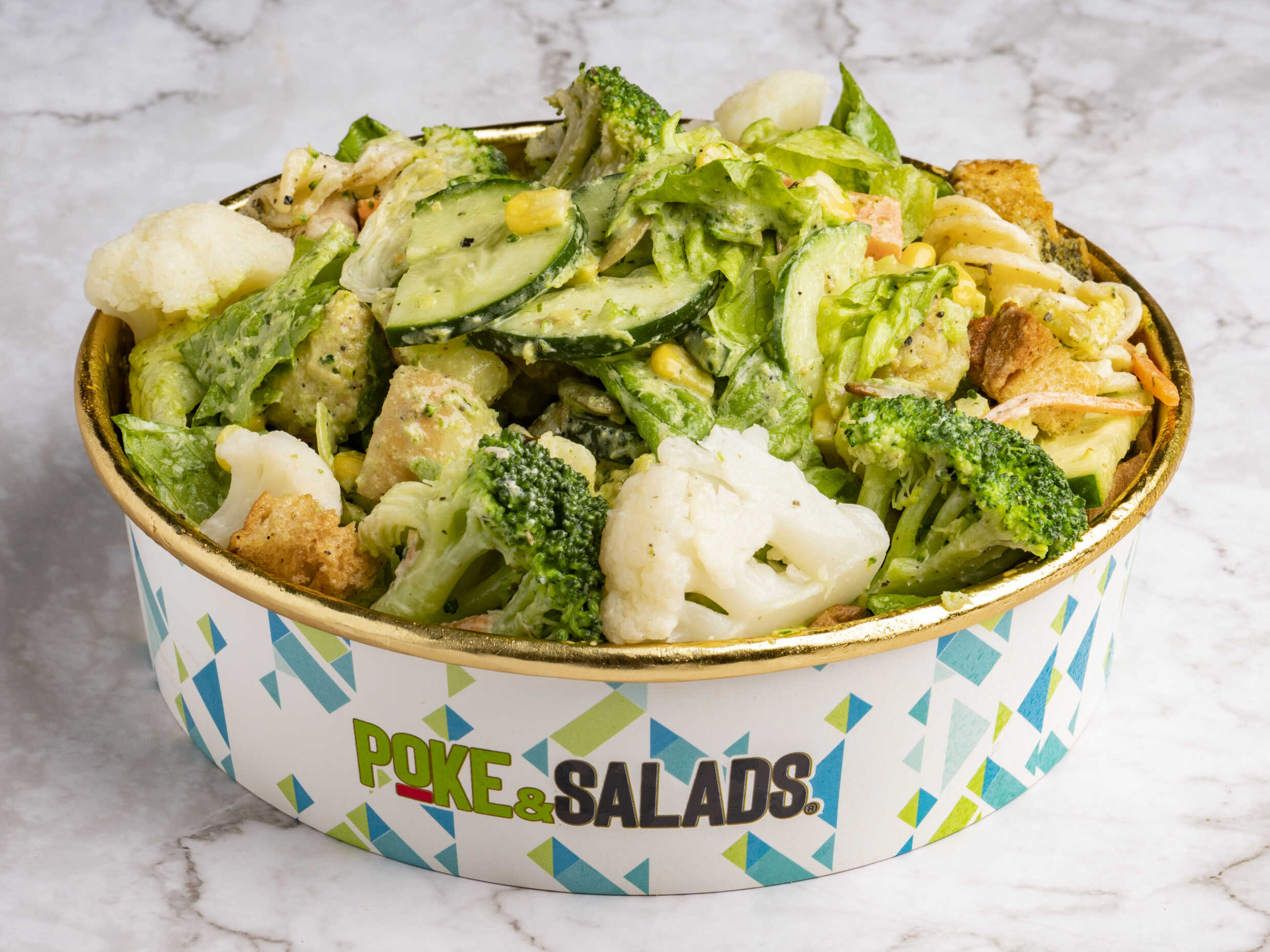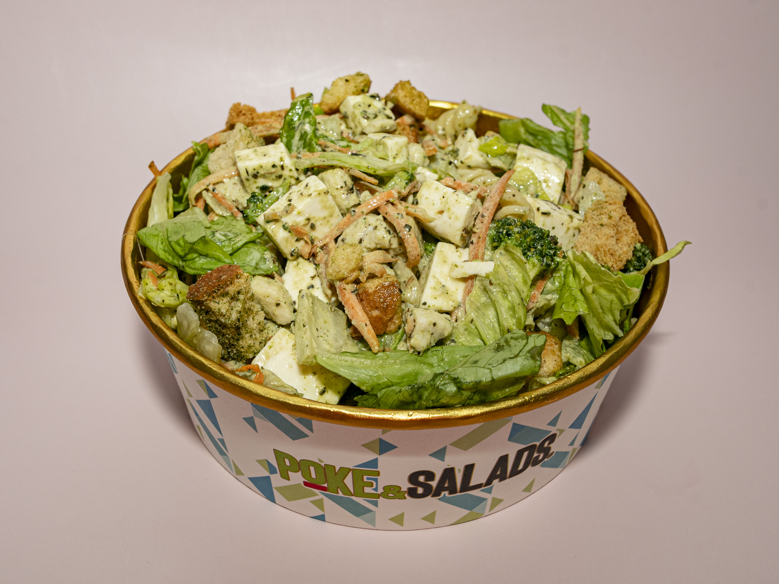 Lechuga, pasta, zanahoria, brócoli, panela, pollo finas hierbas, aderezos cilantro, aderezos aguacate y crotones.