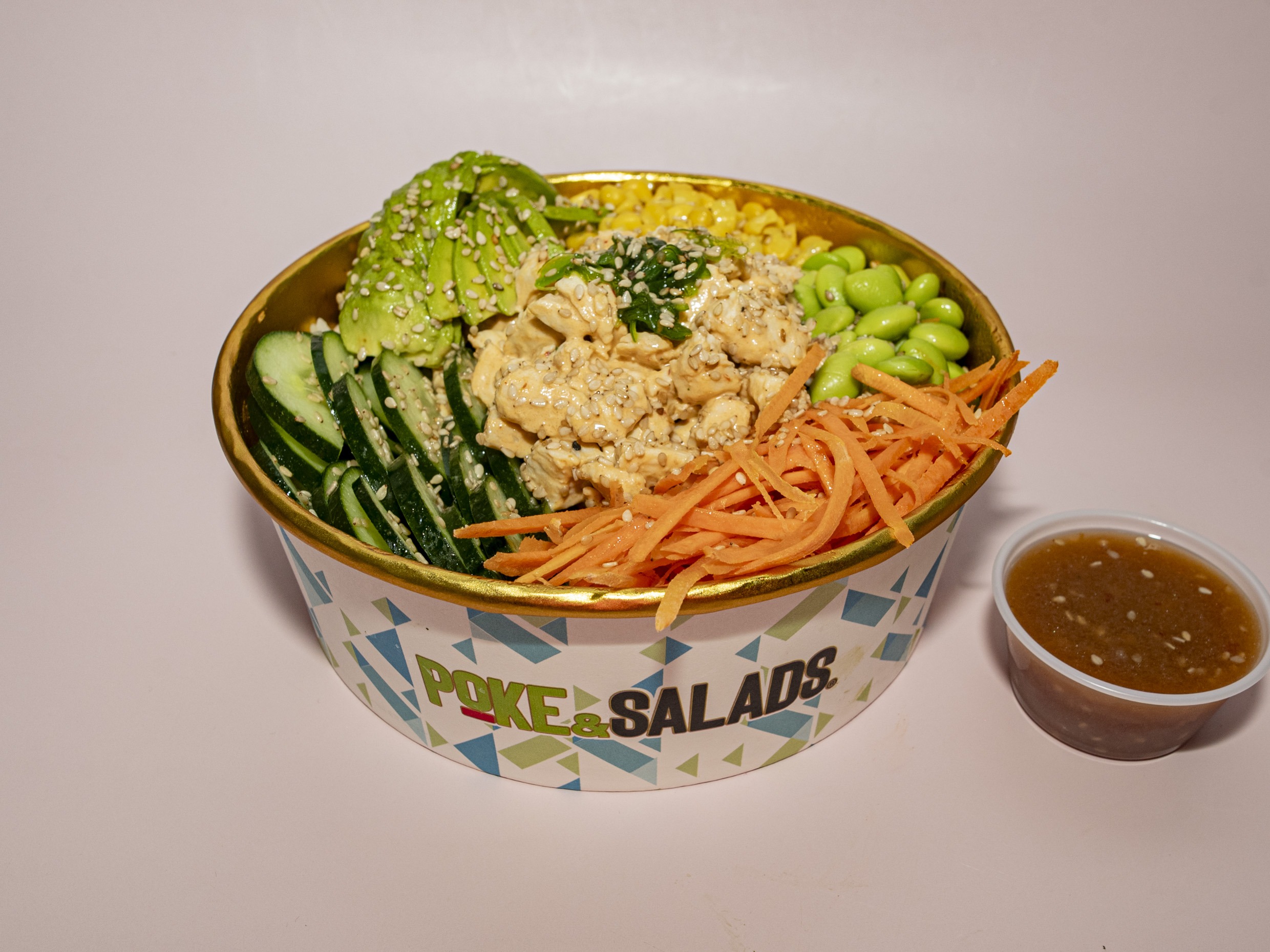 Arroz, aguacate, pepino, frijol edamame, alga wakame, zanahoria, elote, pollo natural, aderezos chipotle.
