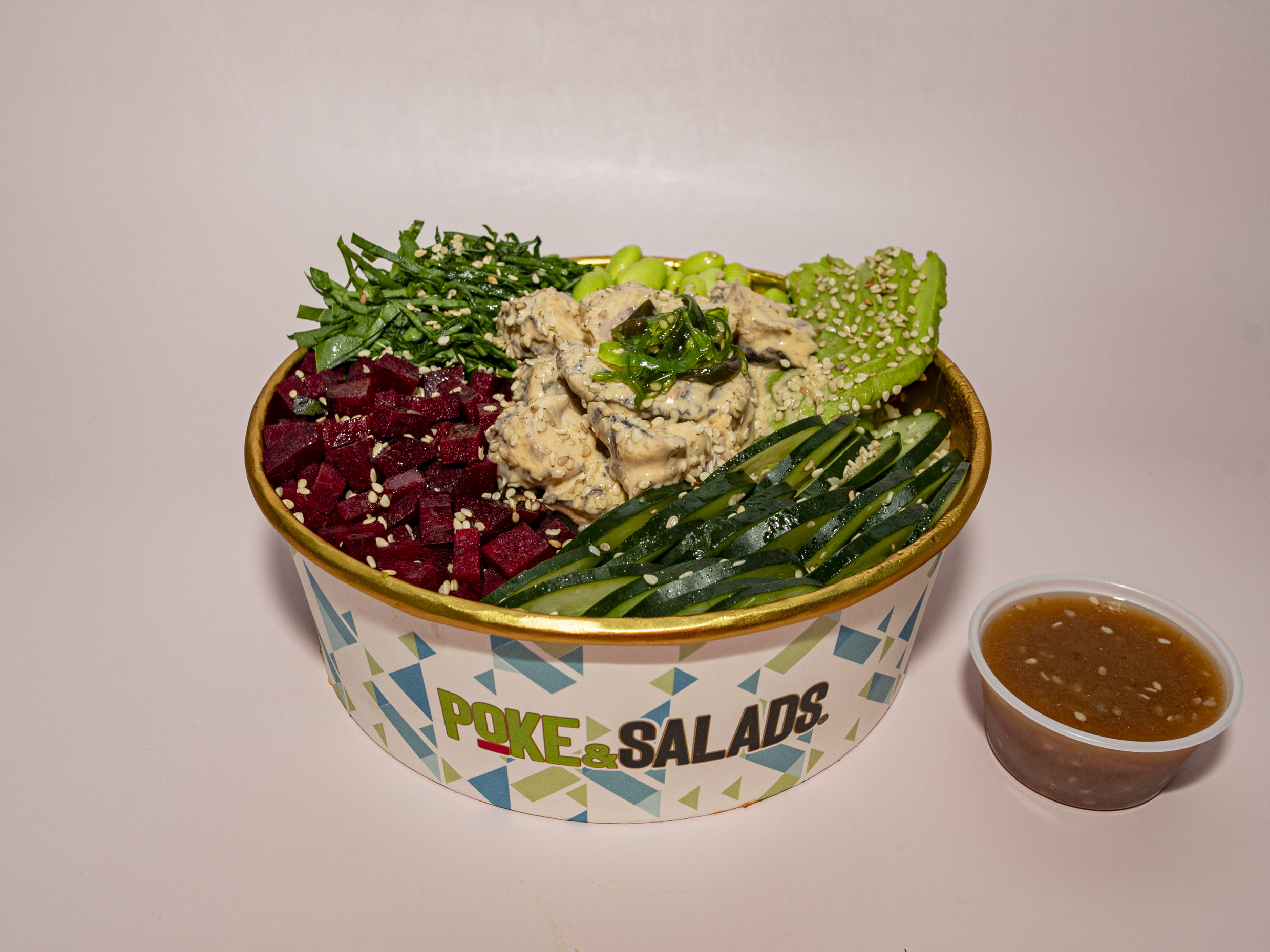 Arroz, aguacate, pepino, frijol edamame, alga wakame, Betabel, espinaca, pulpo, aderezos chipotle.