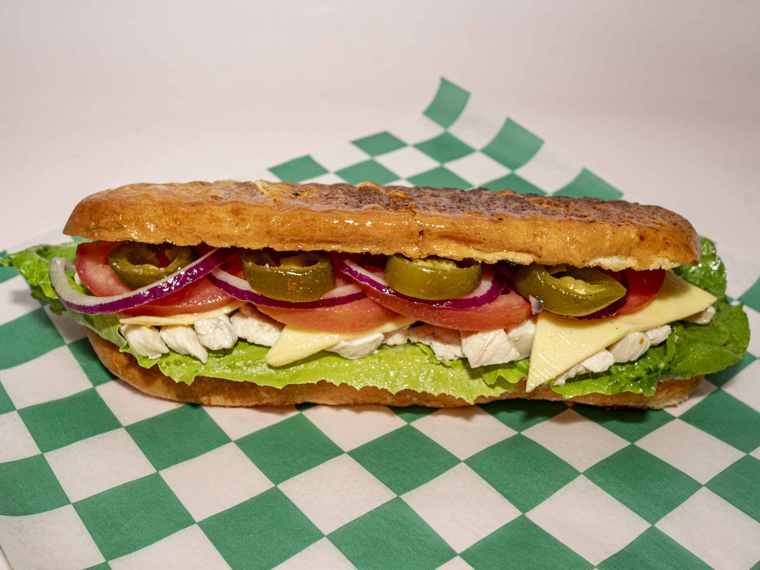 Pollo con aderezos ranch, jitomate, cebolla, lechuga, chile jalapeño, queso manchego,
