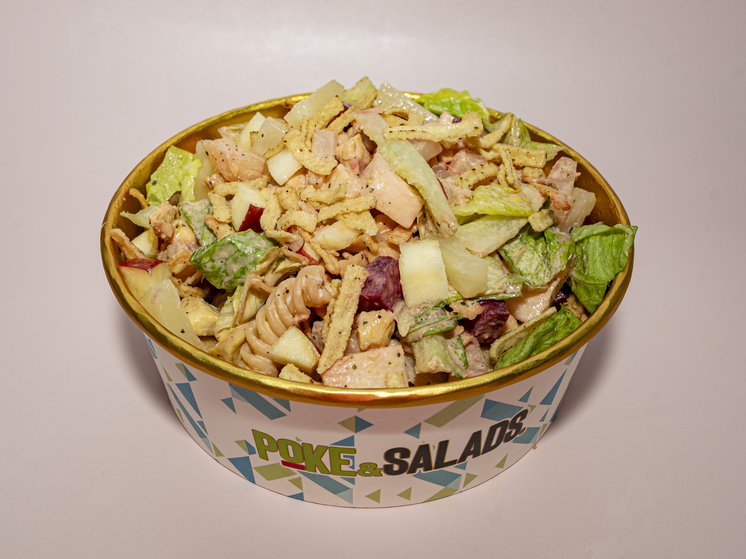 Lechuga, pasta, brócoli, piña manzana, jicama, aderezos mil islas, pollo pimienta limón, frituras.