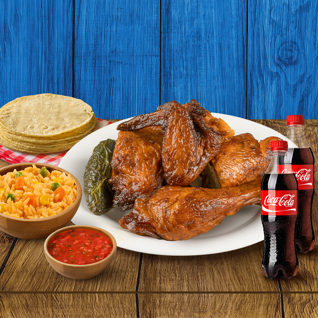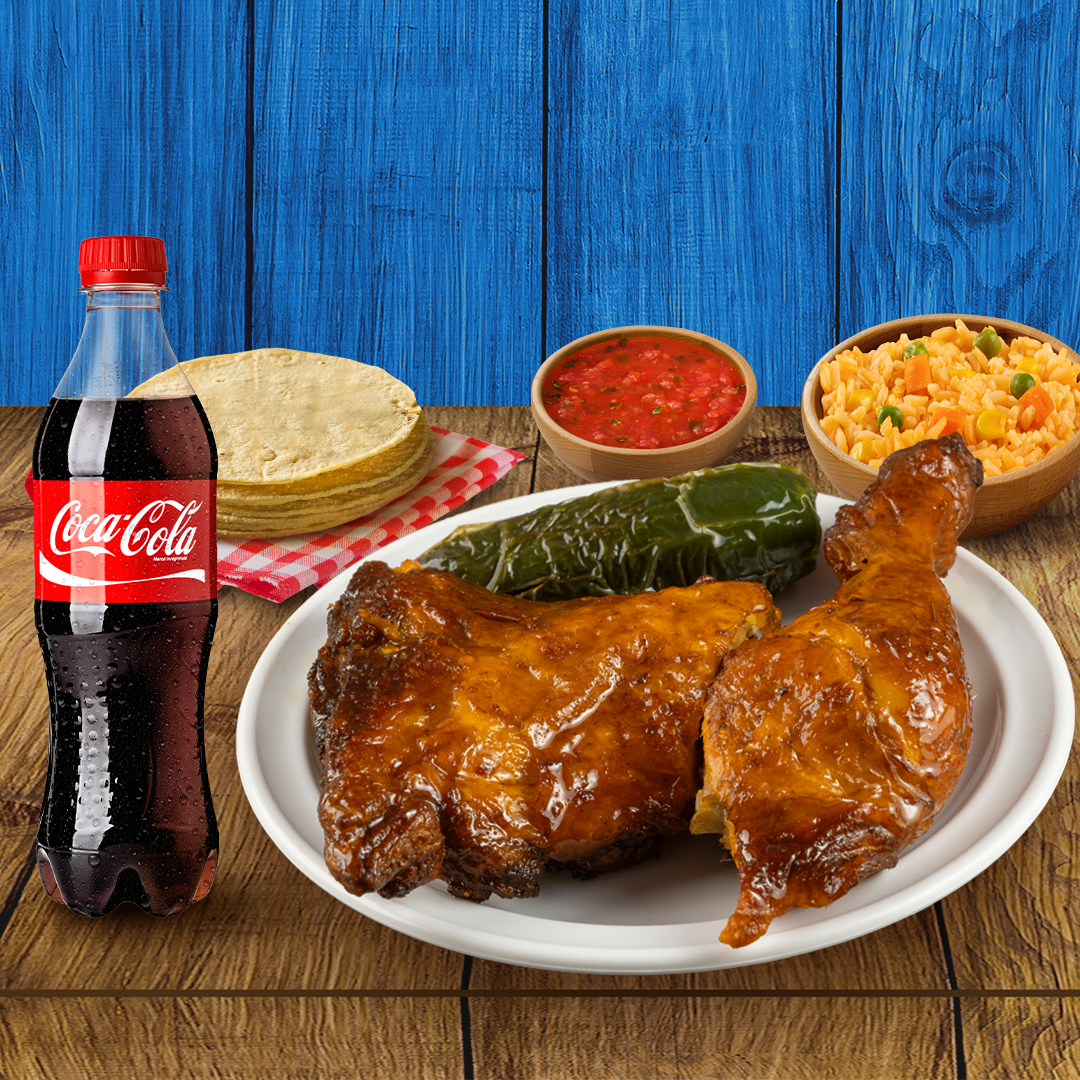 Medio pollo estilo carnitas, doradito y extrajugoso, con un acompañamiento a elegir y 2 refrescos chicos para una comida completa para 2 personas.