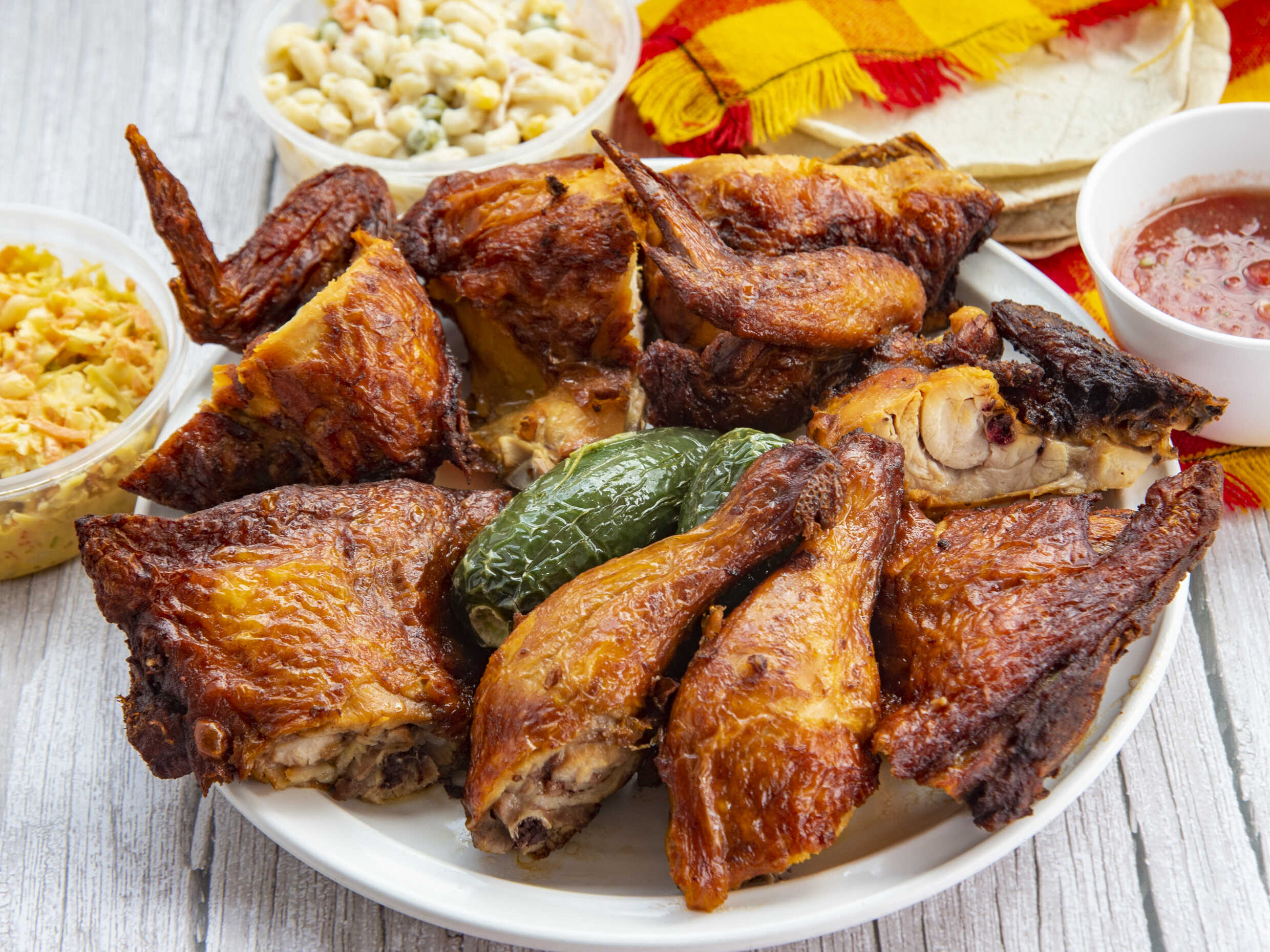 1 pollo completo estilo carnitas, más 5 piezas en piernas y muslos, con salsa, tortillas y chile toreado