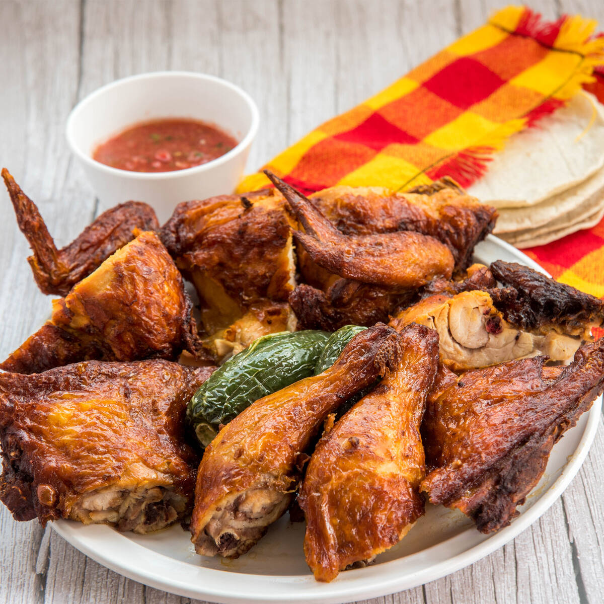 1 pollo tamaño mediano, con chile toreado y tortillas