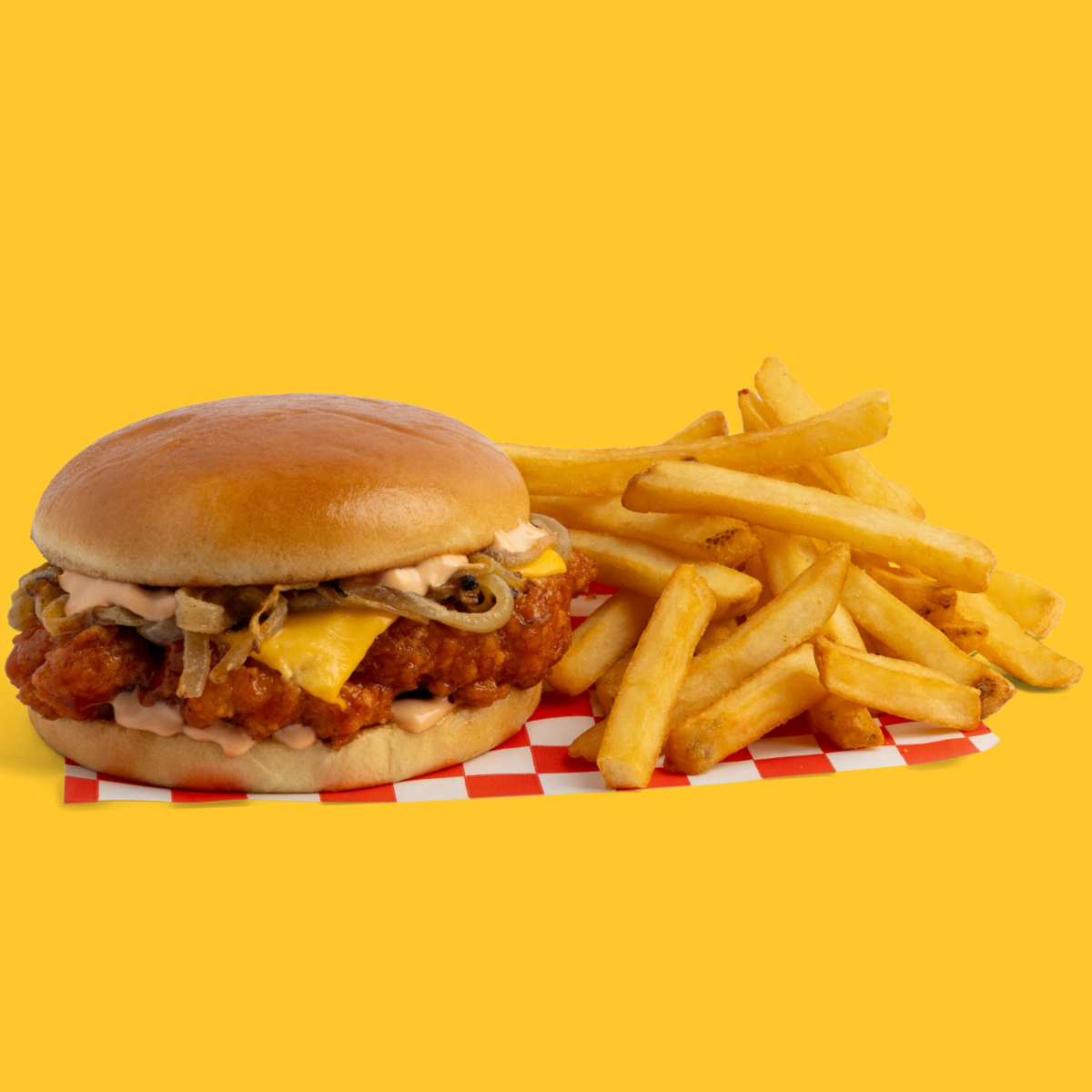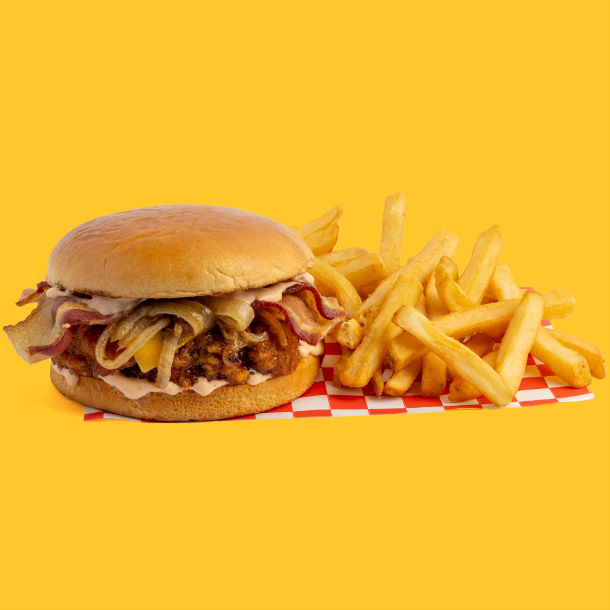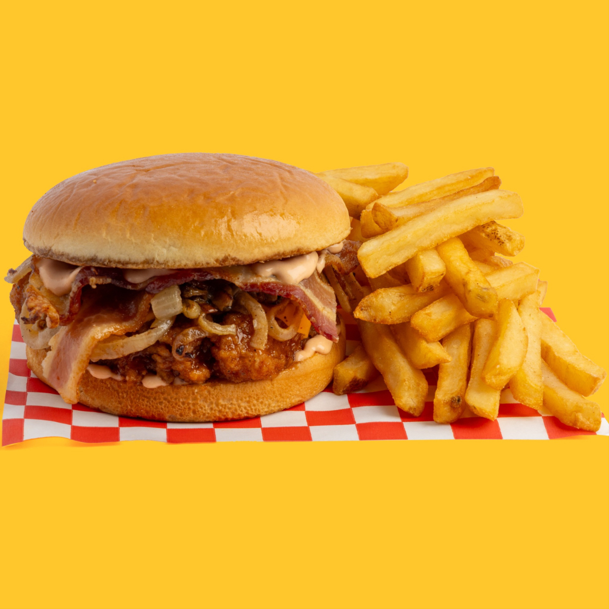 Pan Brioche con un toque de mantequilla, 140 grs de bonelees bañados en salsa Mango Habanero, tocino, cebolla caramelizada, queso americano y aderezo clasico acompañado de papas a la francesa