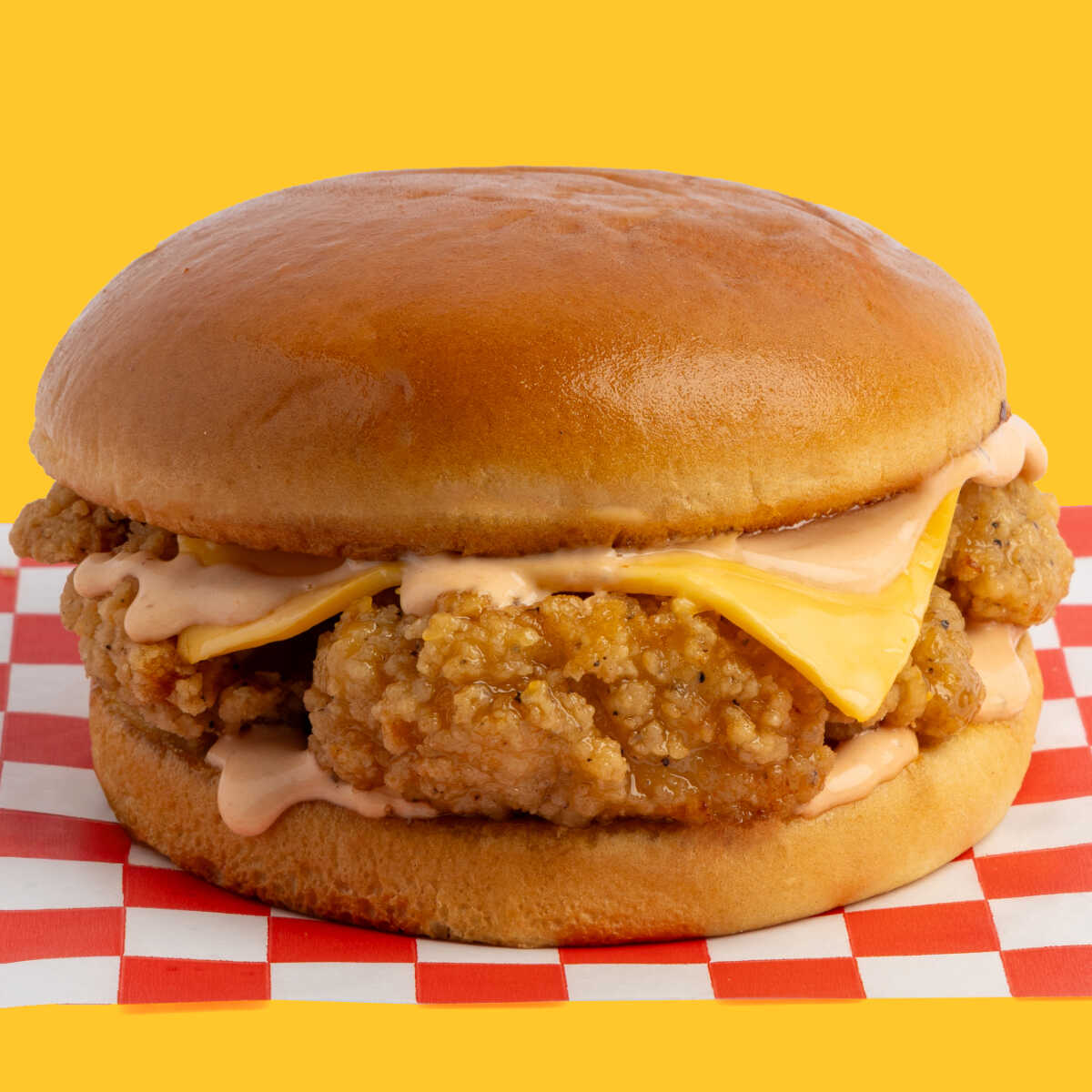 Pan Brioche con un toque de mantequilla, 140 grs de bonelees, queso americano y aderezo clasico
