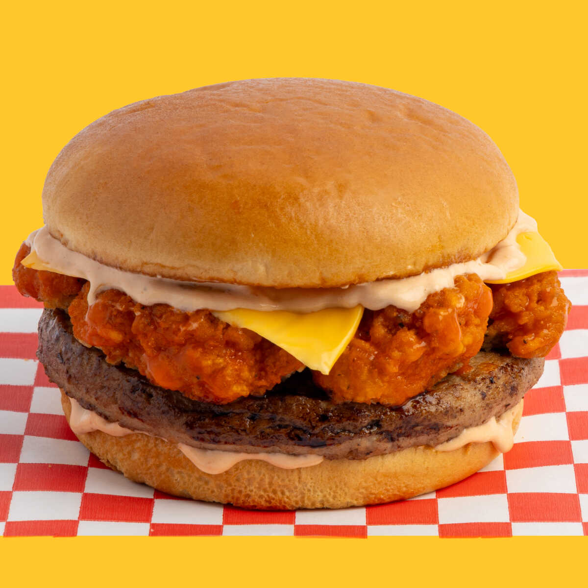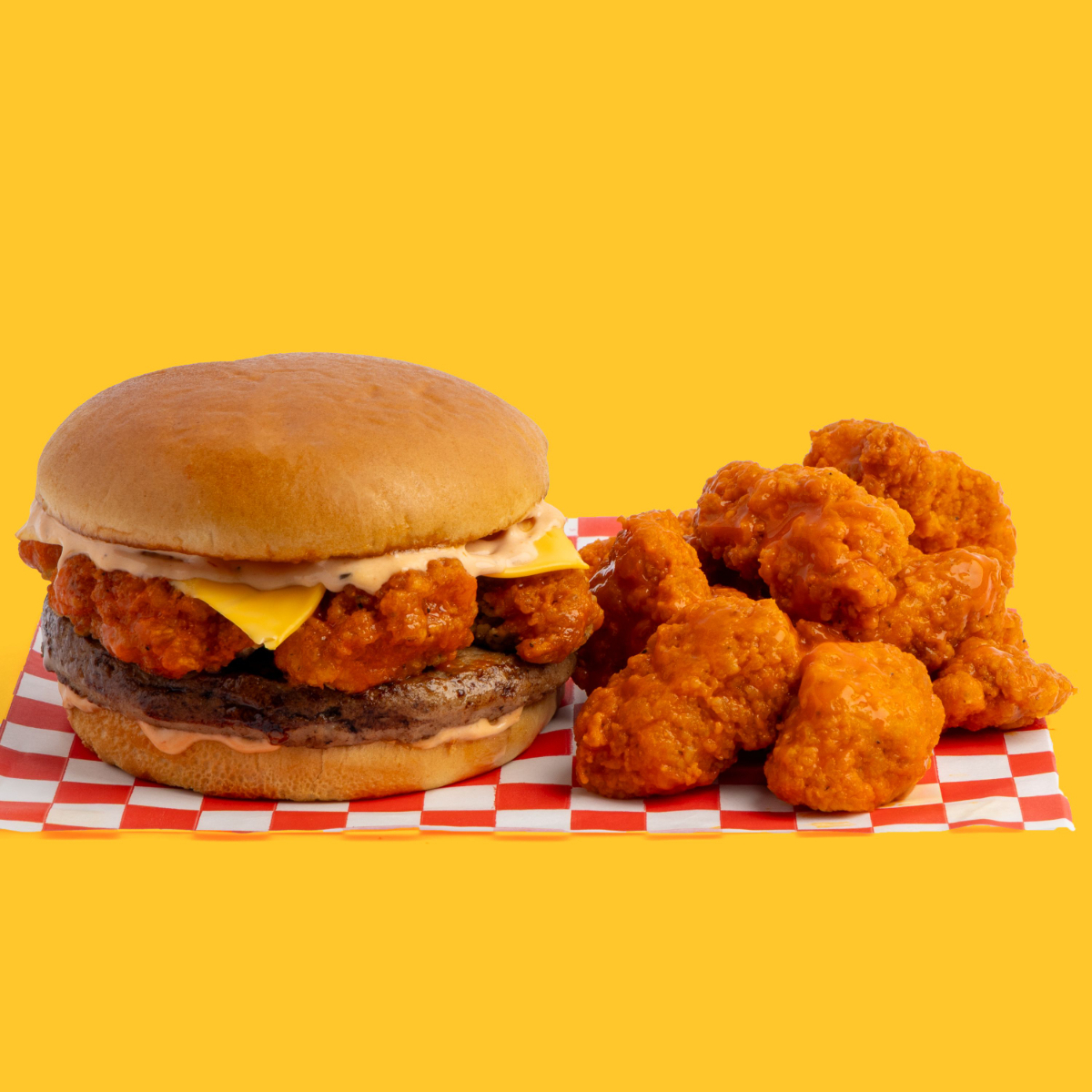 Hamburguesa con Pan Brioche con un toque de mantequilla, 140 grs de bonelees bañados en salsa Buffalo, tocino, queso americano y aderezo clasico