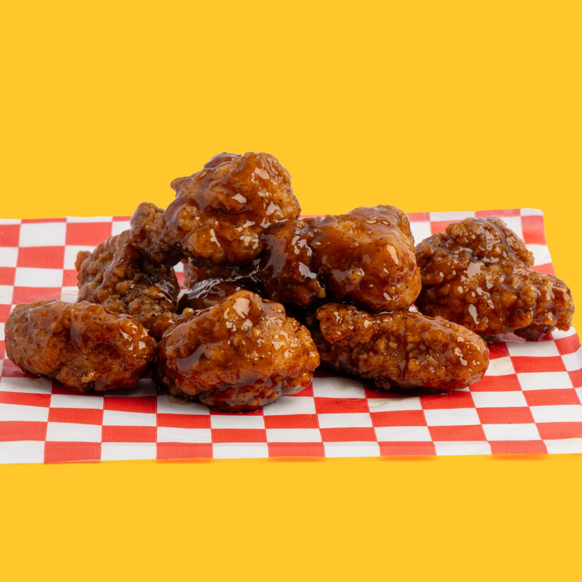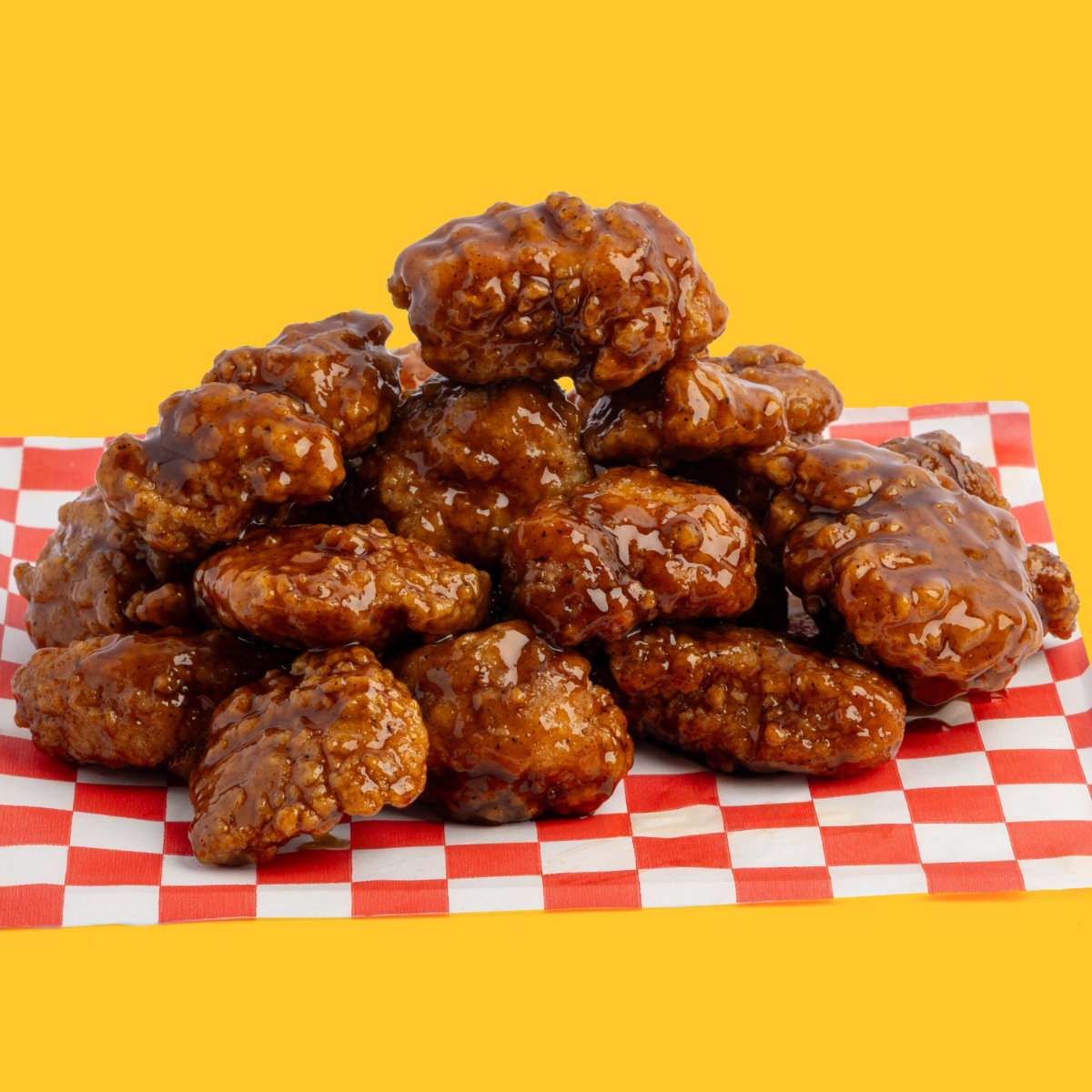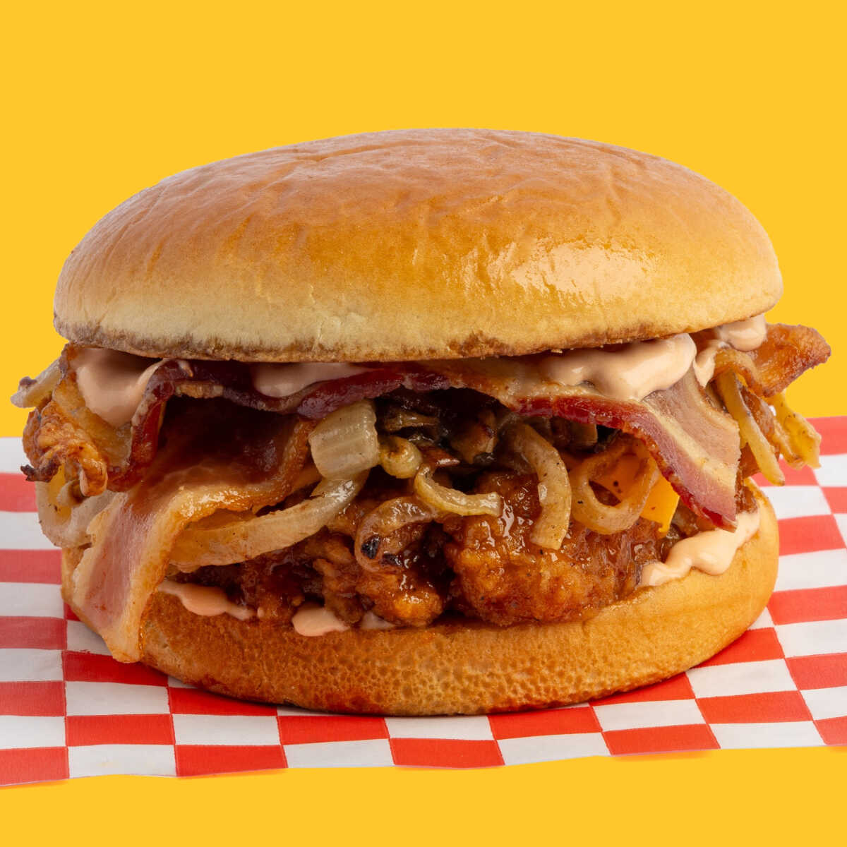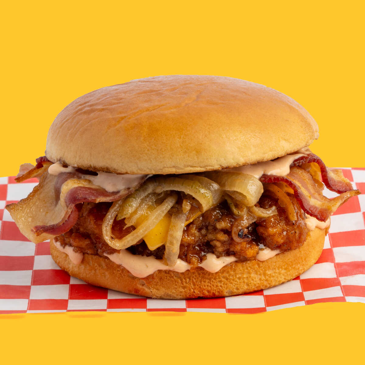 Pan Brioche con un toque de mantequilla, 140 grs de bonelees bañados en salsa BBQ, tocino, cebolla caramelizada, queso americano y aderezo clasico