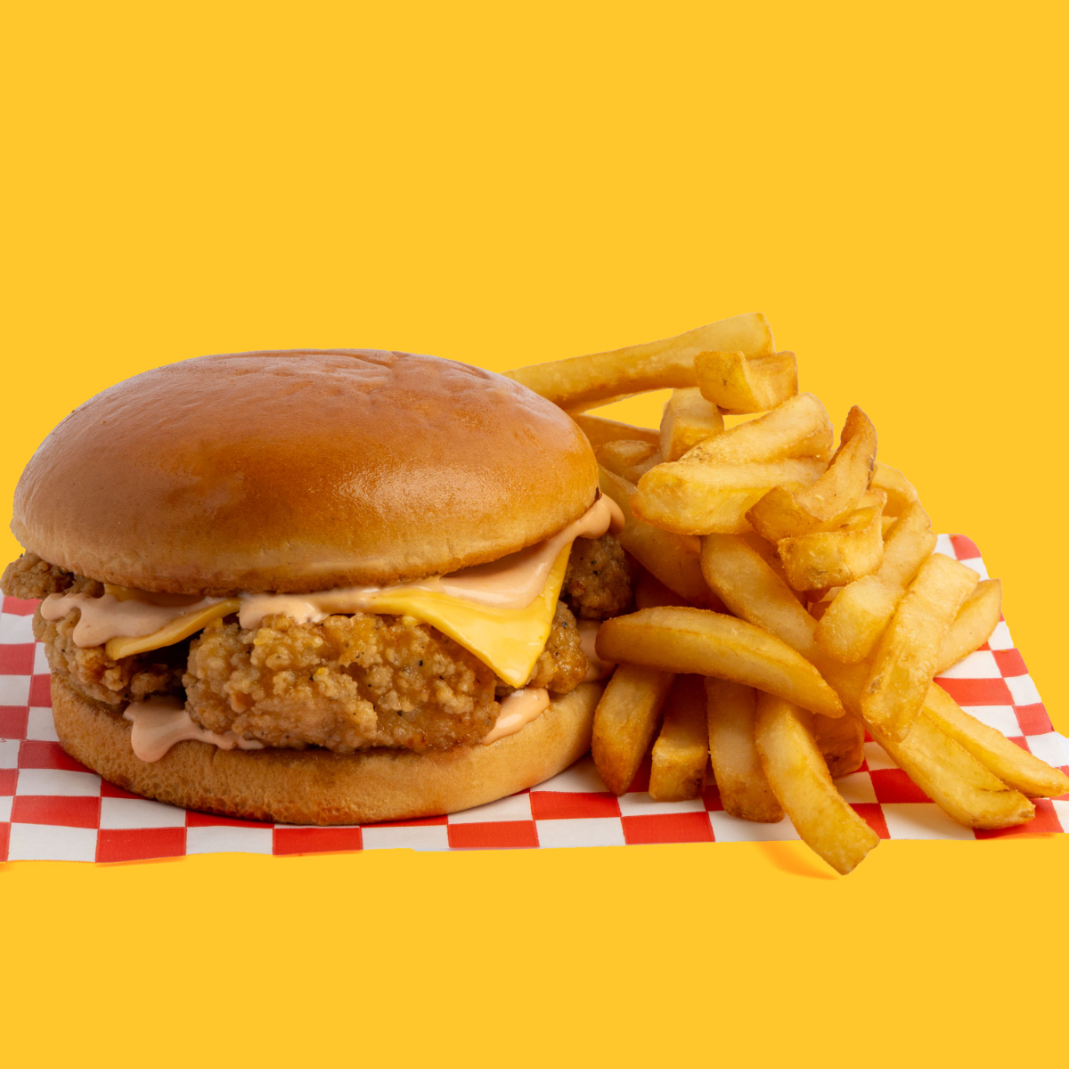 Pan Brioche con un toque de mantequilla, 140 grs de bonelees, queso americano y aderezo clasico acompañado de papas a la francesa