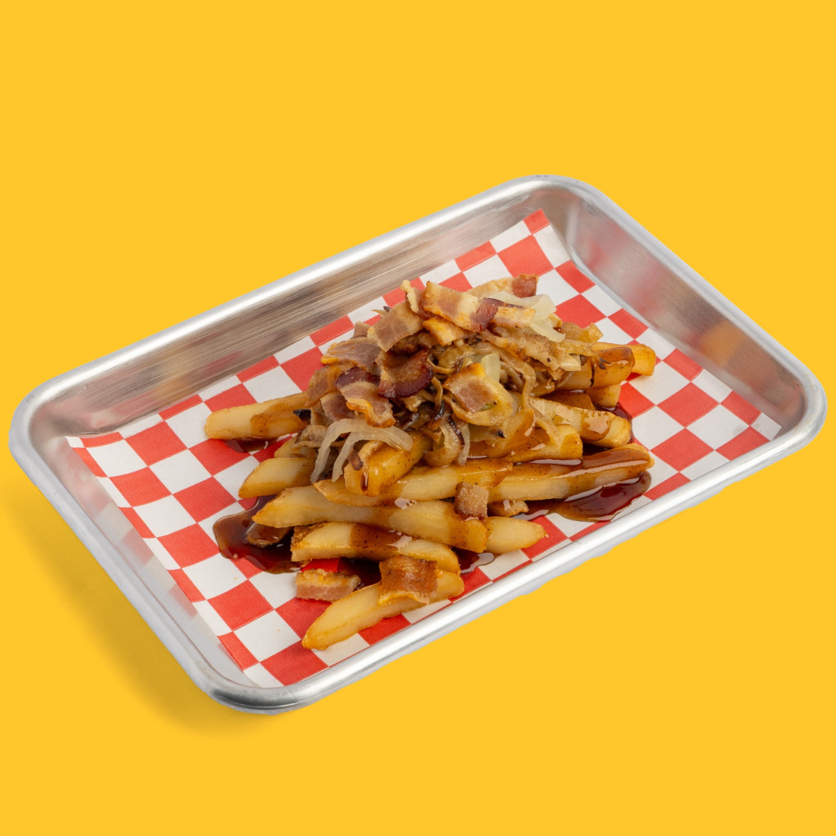150gr de papas a la francesa fritas con cebolla caramelizada y tocino, bañadas en salsa BBQ