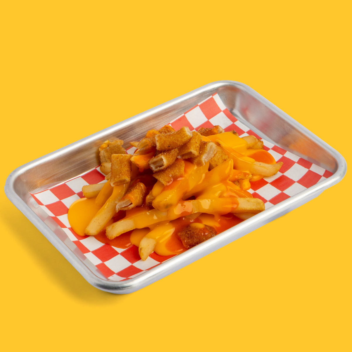 150gr de papas a la francesa fritas con aros de cebolla en cuadros, bañados en salsa Buffalo y salsa Cheddar