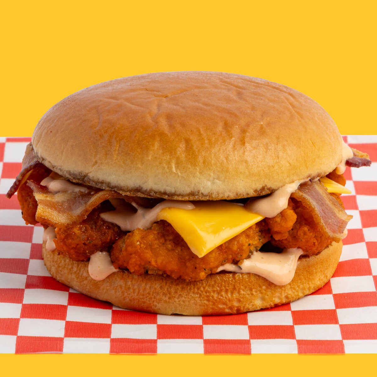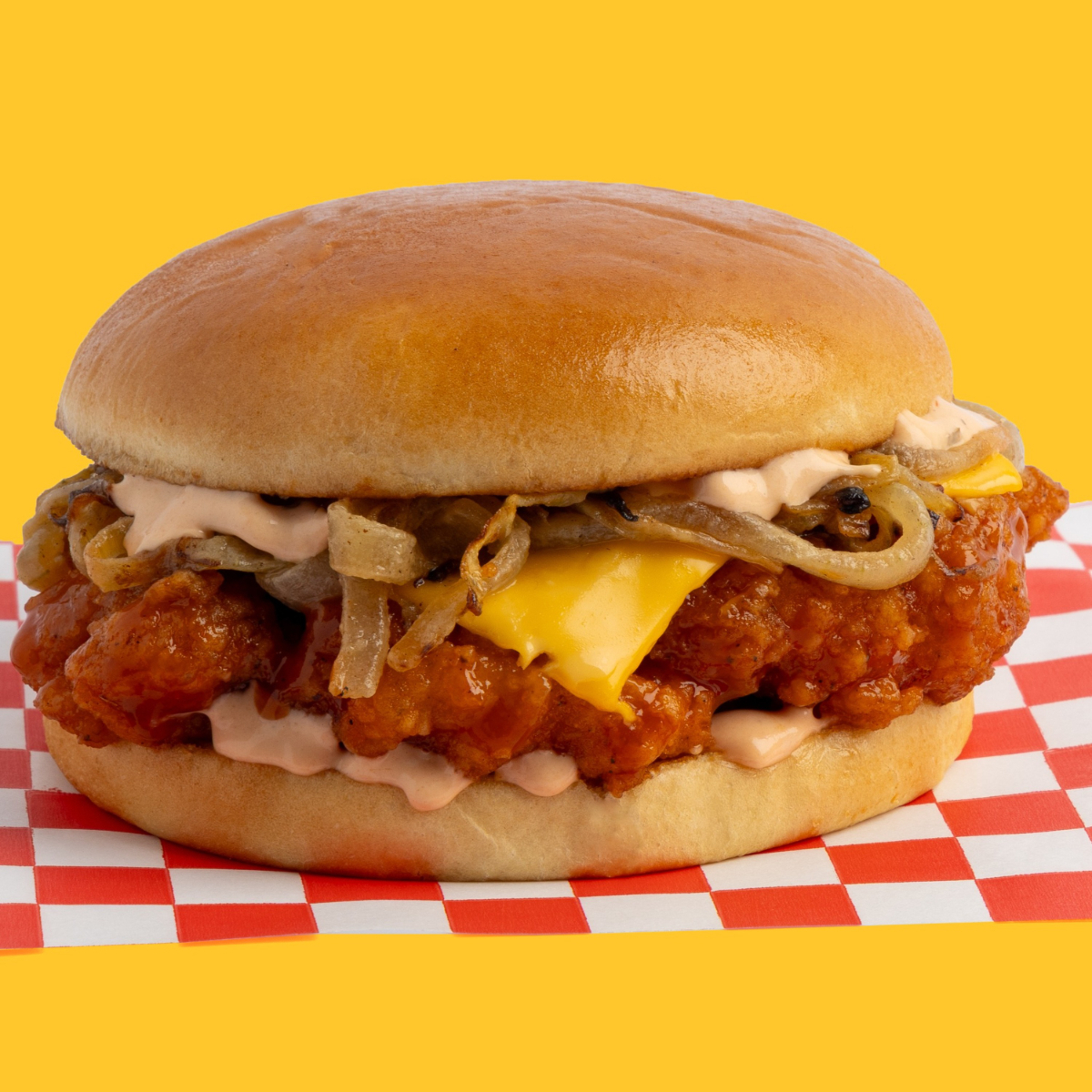 Pan Brioche con un toque de mantequilla, 140 grs de bonelees bañados en salsa Mango Habanero, tocino, cebolla caramelizada, queso americano y aderezo clasico