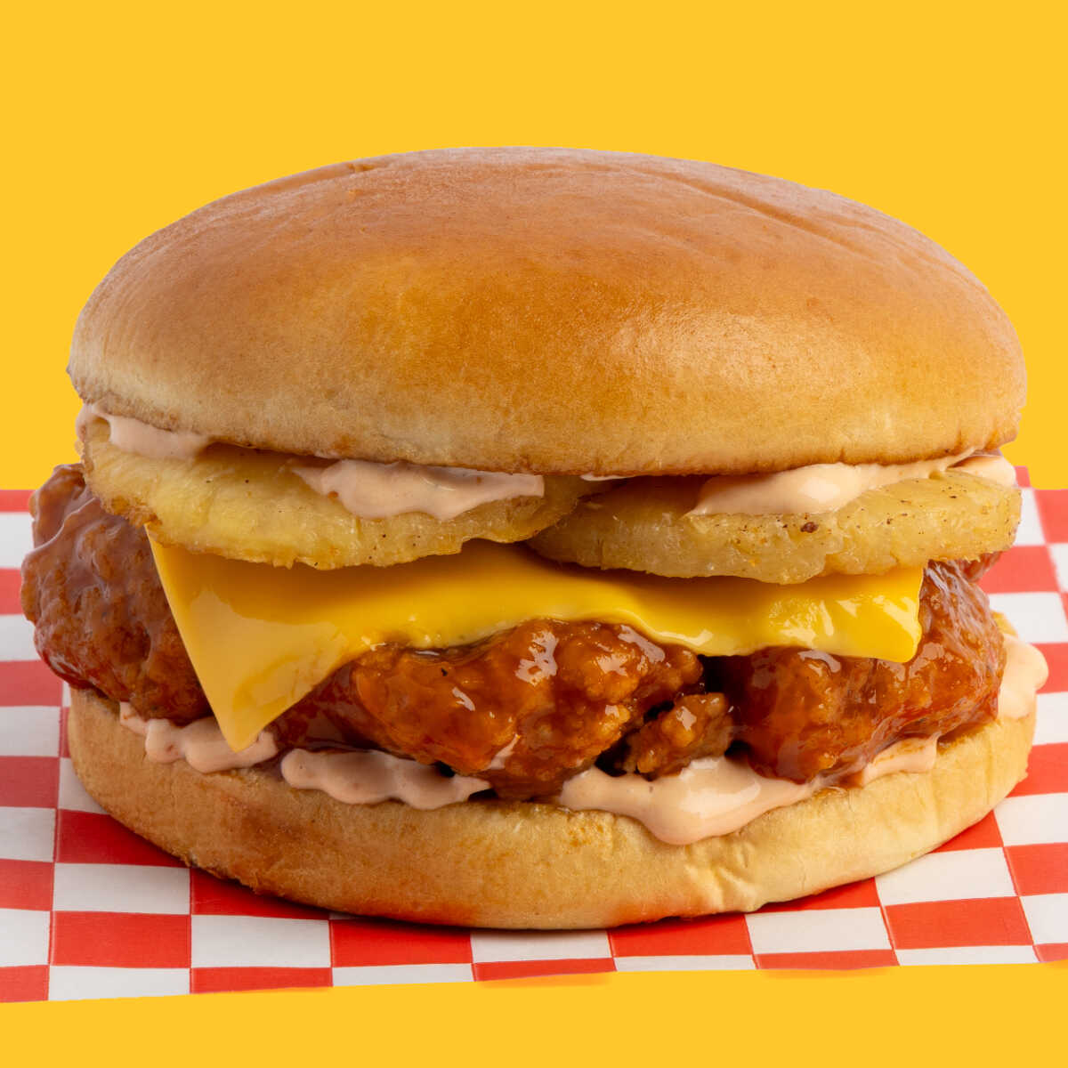 Pan Brioche con un toque de mantequilla, 140 grs de bonelees, rodaja de piña, queso americano y aderezo clasico