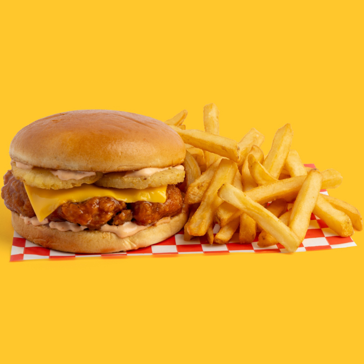 Pan Brioche con un toque de mantequilla, 140 grs de bonelees, rodaja de piña, queso americano y aderezo clasico. + papas a la francesa