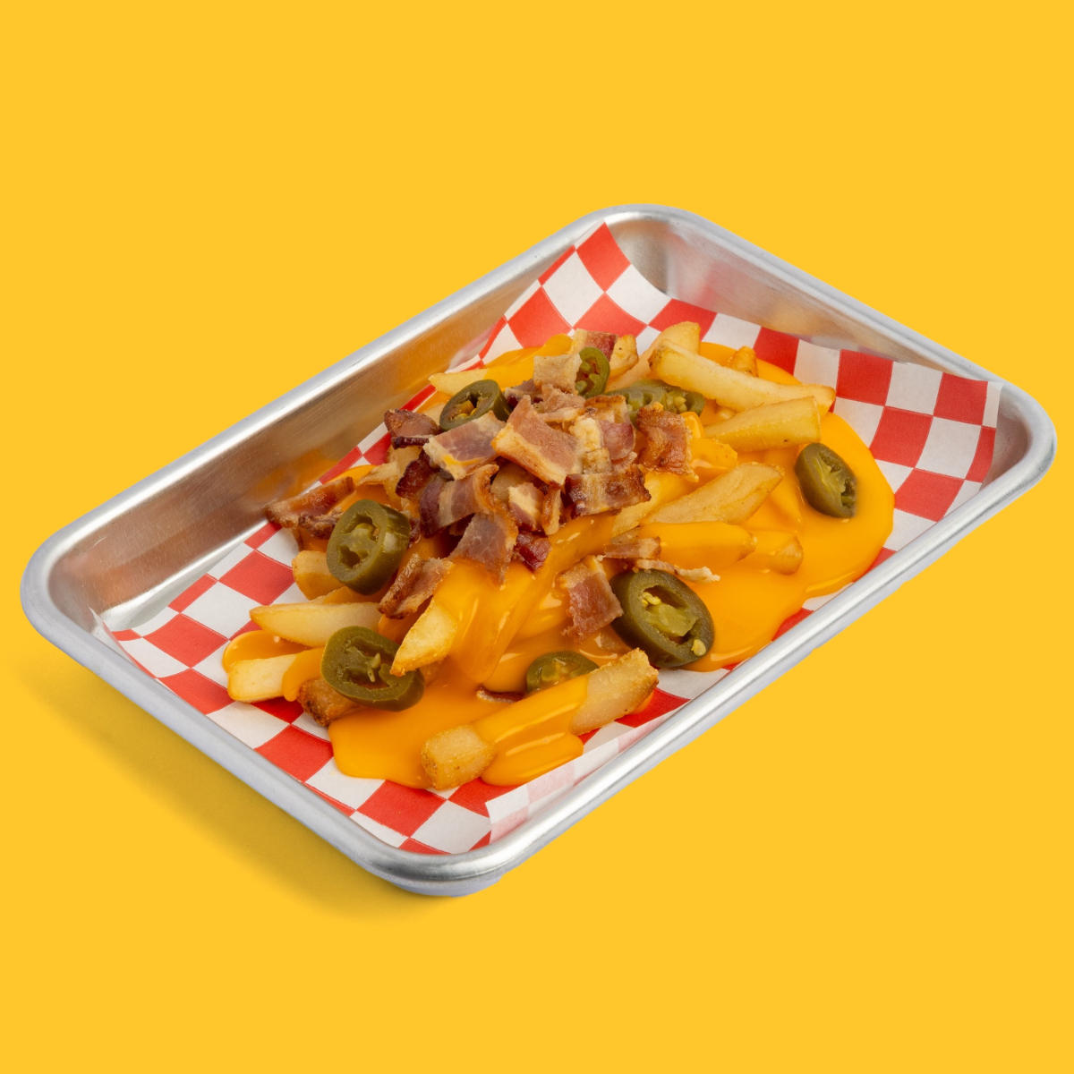 150gr de papas a la francesa fritas con tocino y jalapeños, bañadas en salsa Cheddar