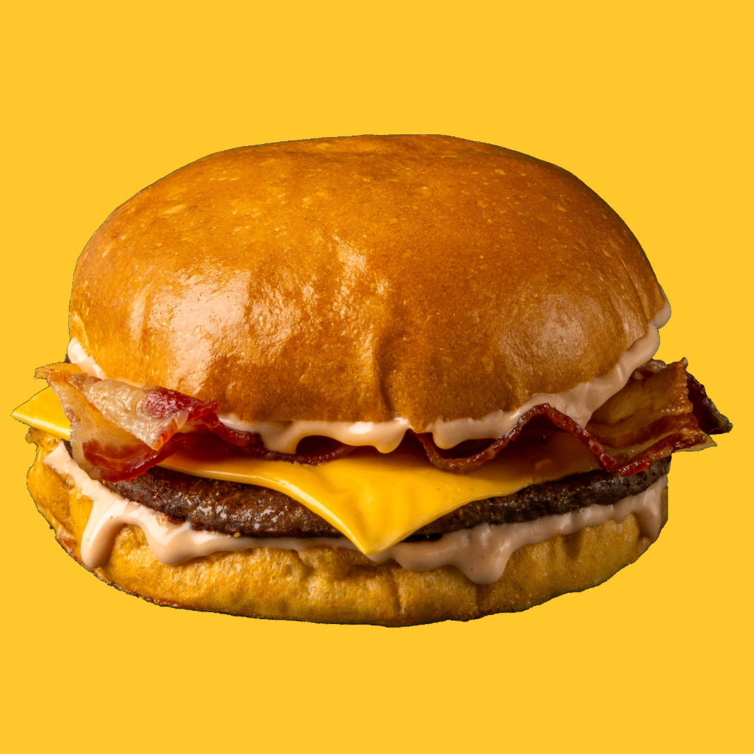 Pan Brioche con un toque de mantequilla, carne de res, tocino, queso americano y aderezo clasico