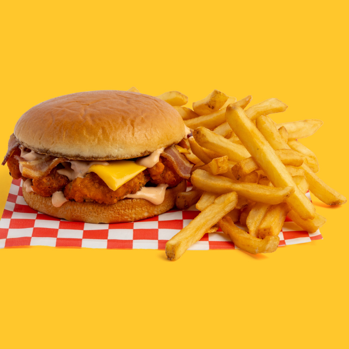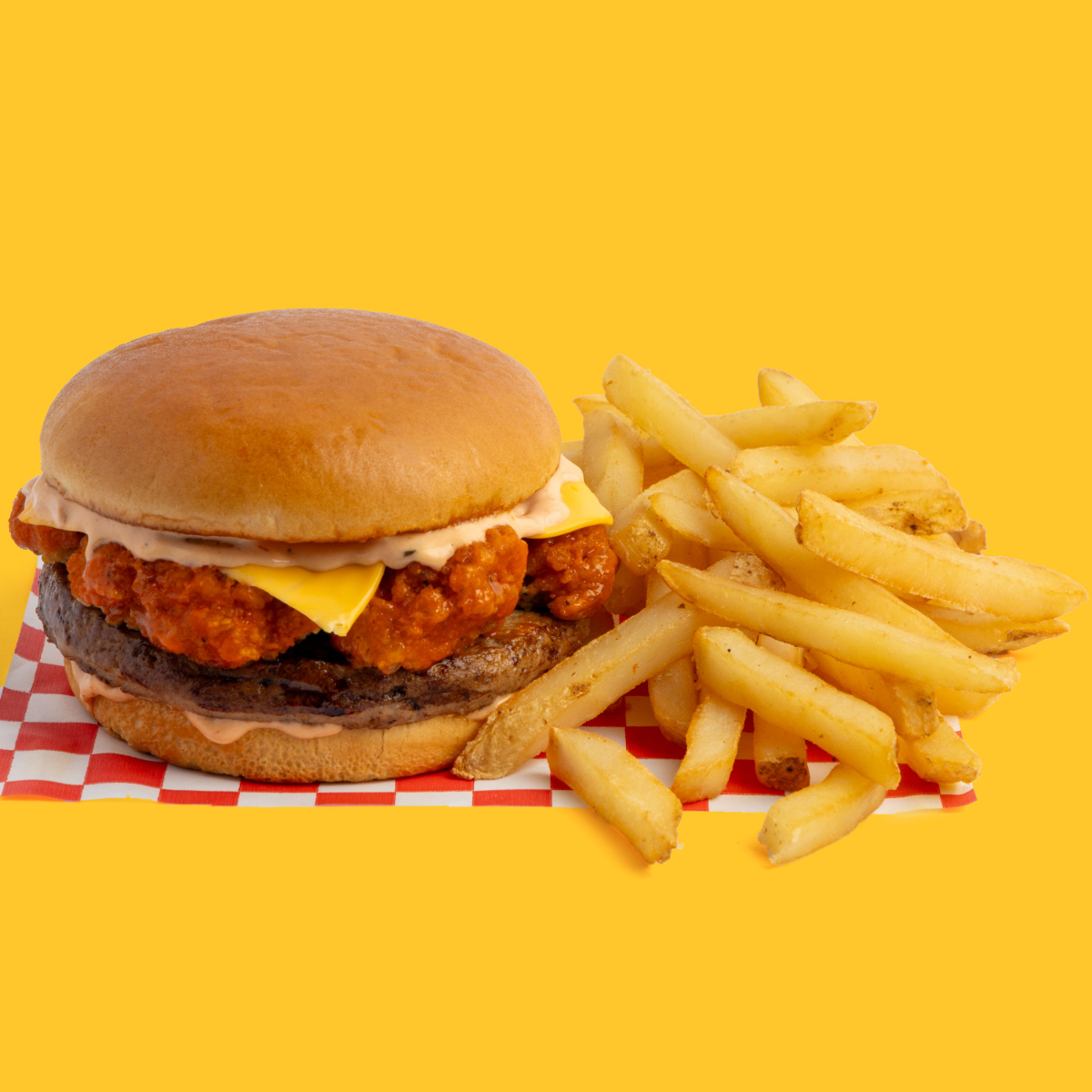 Pan Brioche con un toque de mantequilla, 140 grs de bonelees bañados en salsa Buffalo, tocino, queso americano y aderezo clasico acompañado de papas a la francesa