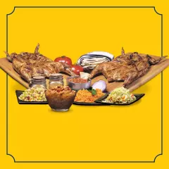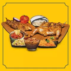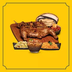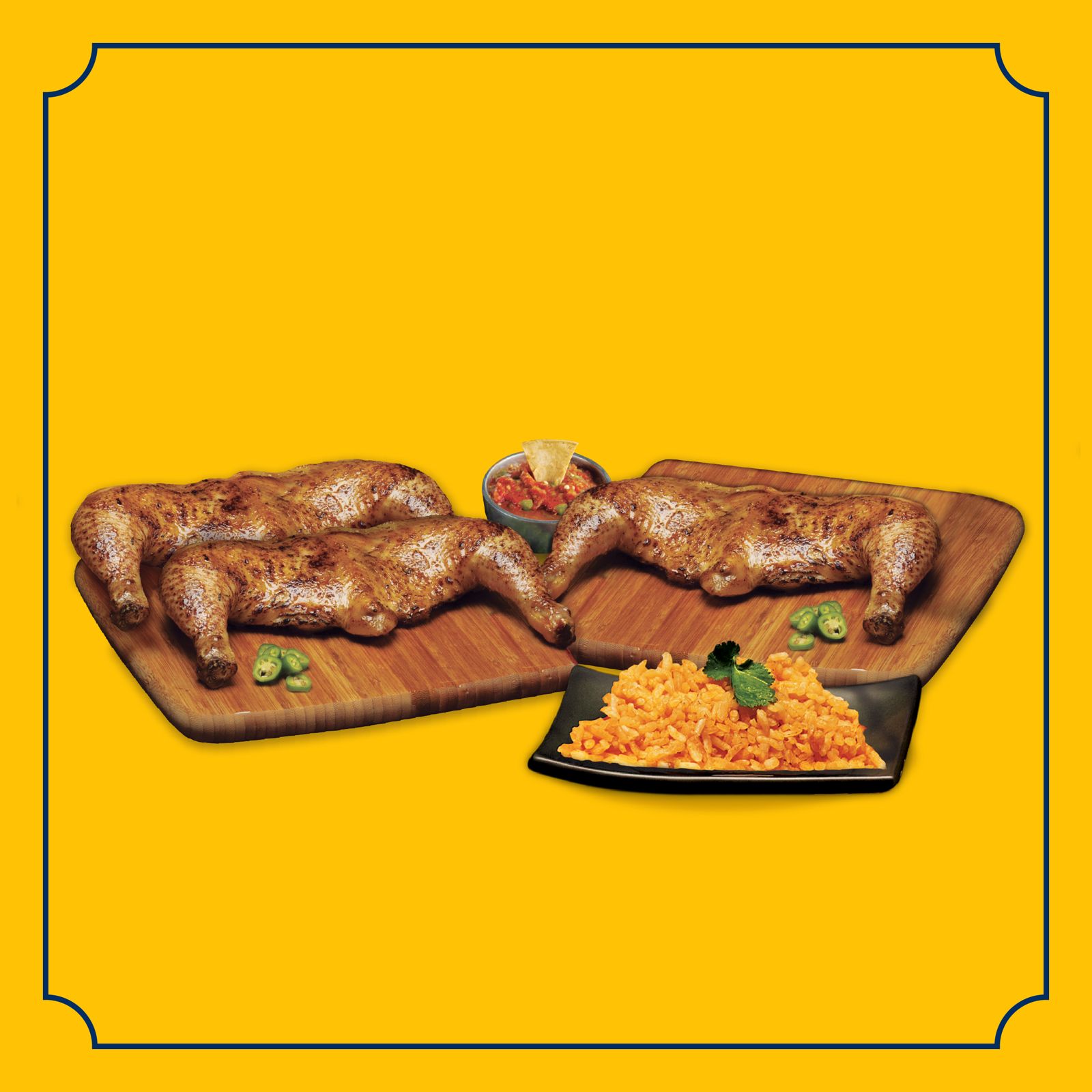 Un pollo asado, 3 complementos a elegir (1) y medio pollo asado.
