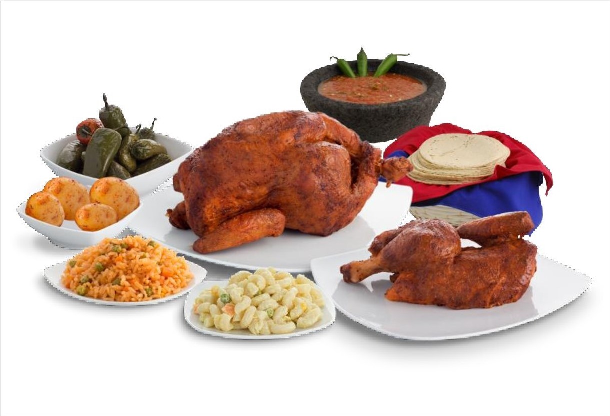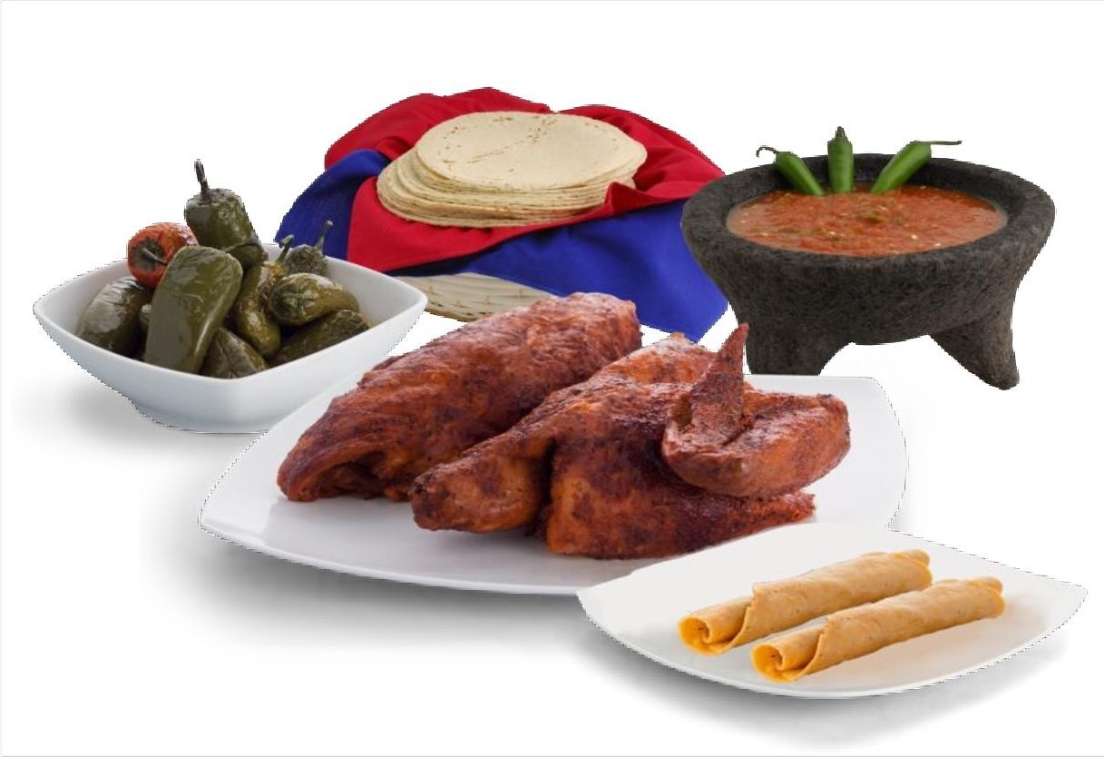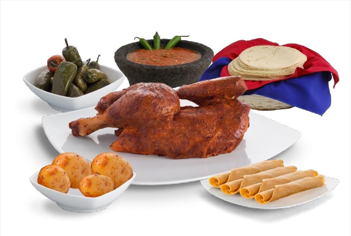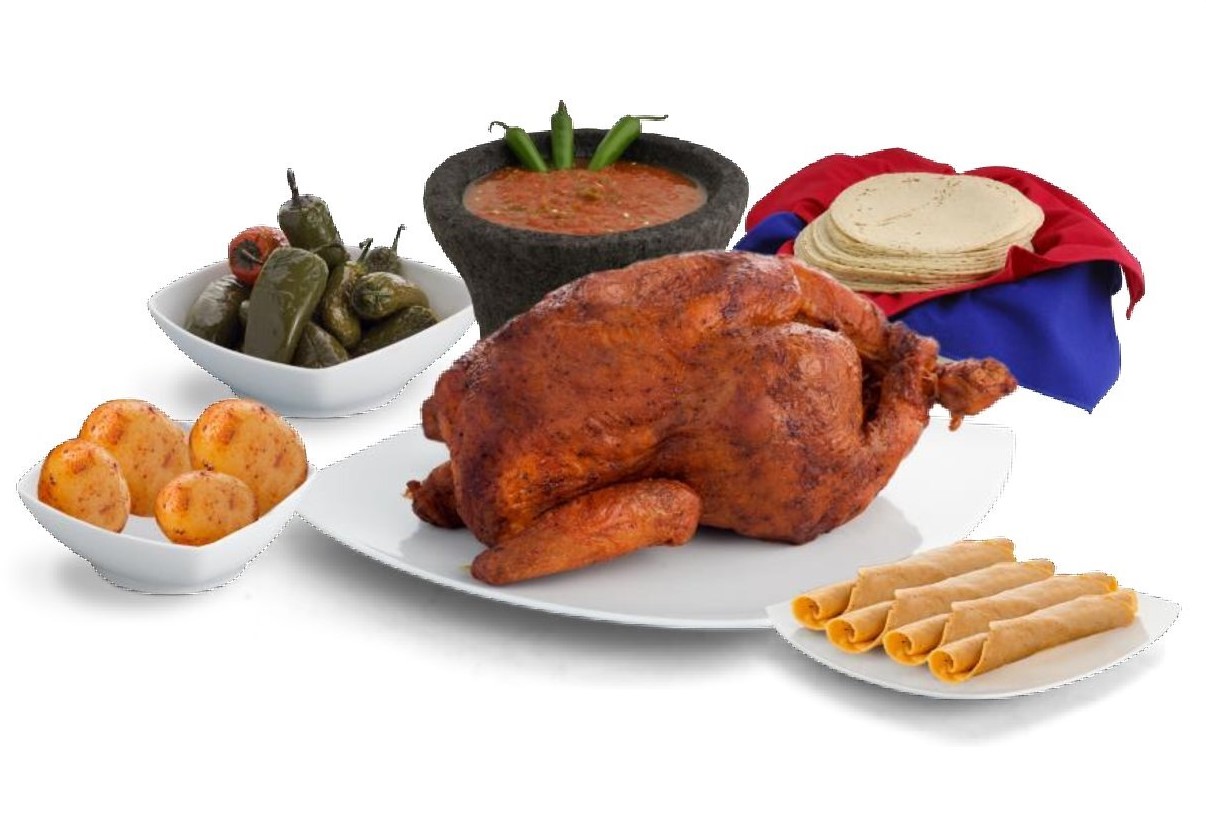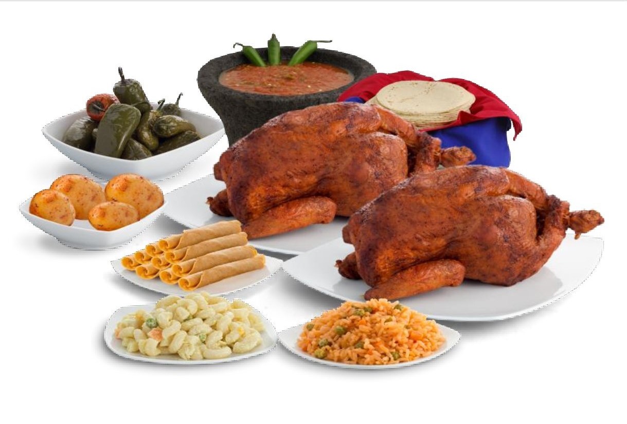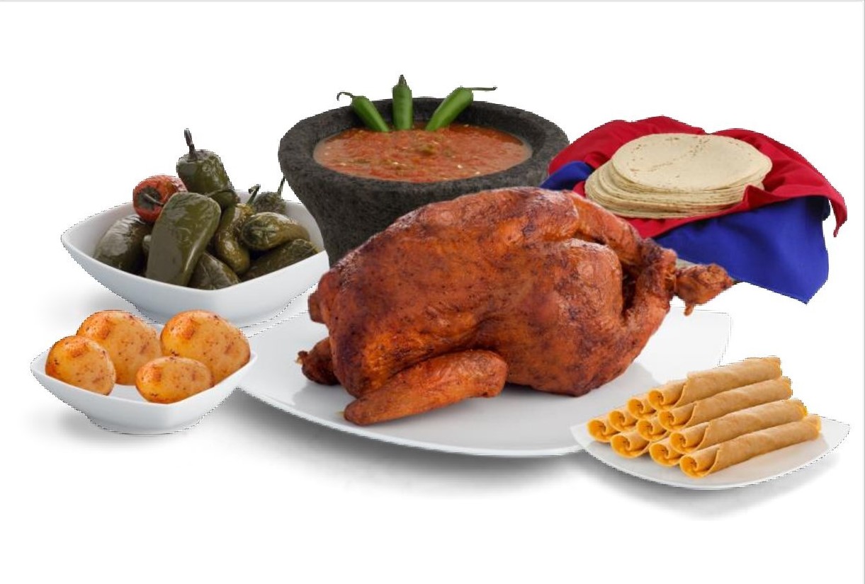 2 Pollos rostizados, 10 tacos drados de pollo, 1 orden de papas, 1 orden de arroz rojo y 1 orden de ensalada de codo.