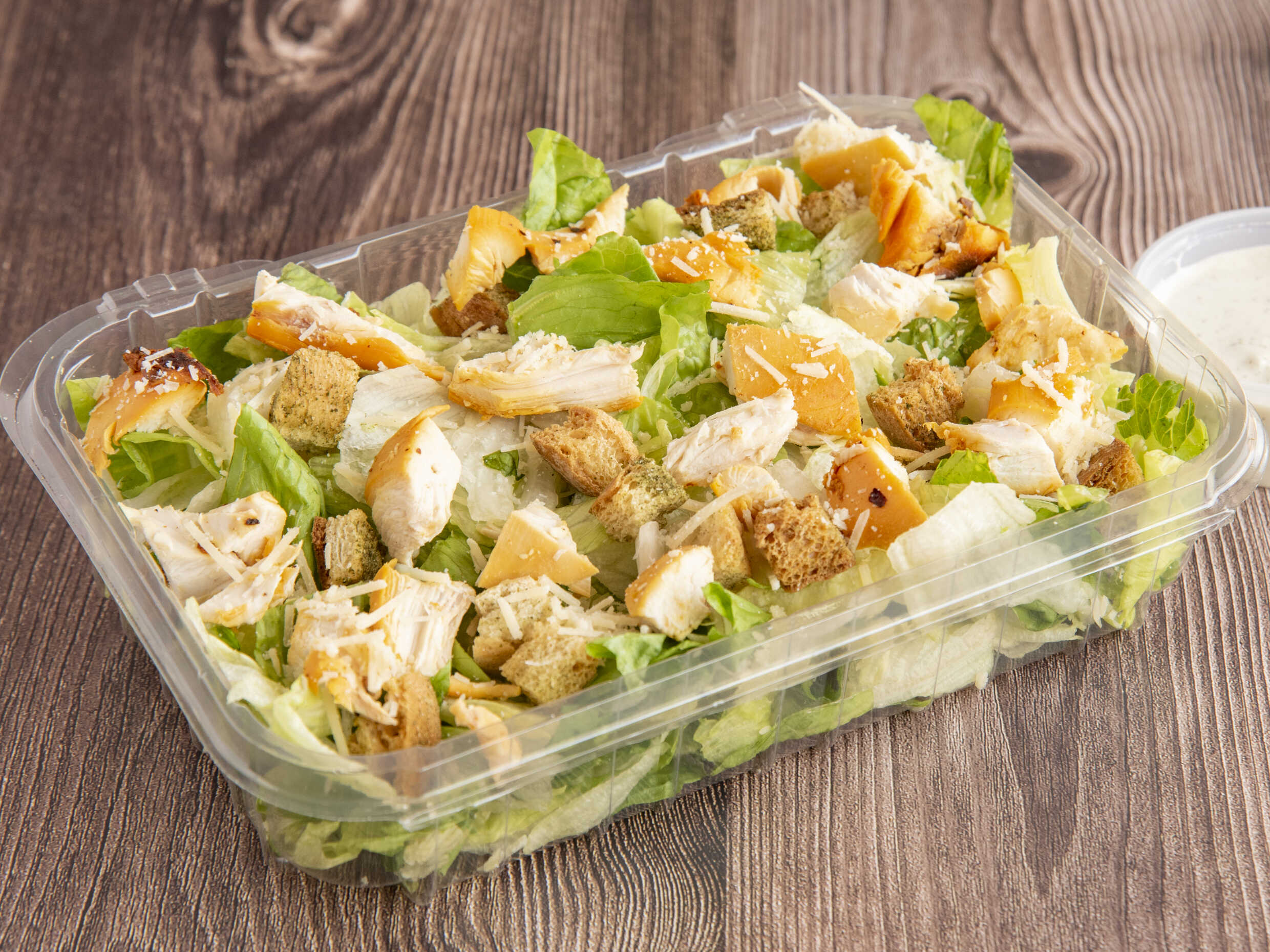Fresca lechuga orejona con jugosos trozos de pechuga de pollo a la parrilla, queso parmesano, croutones y aderezo César.
