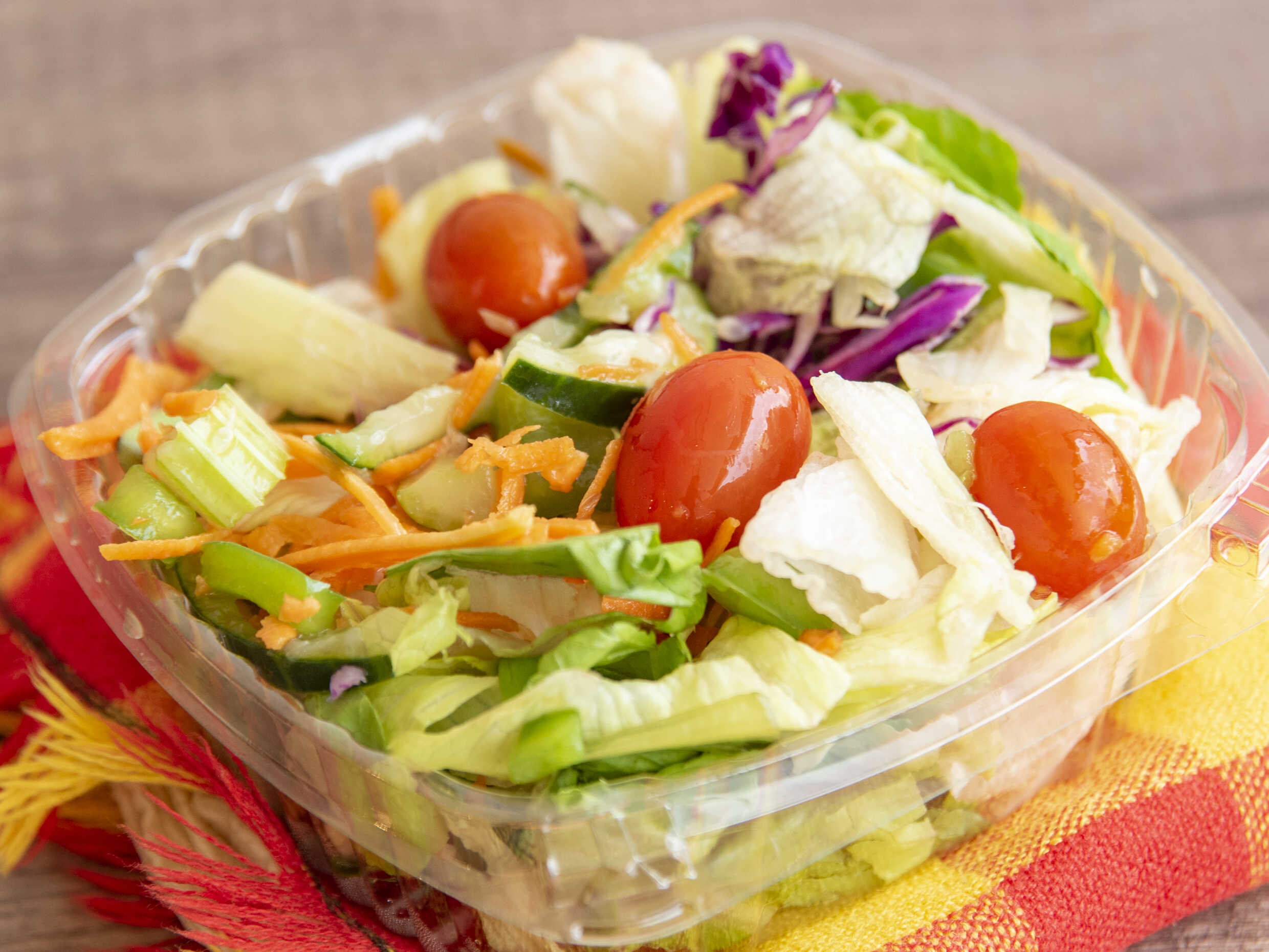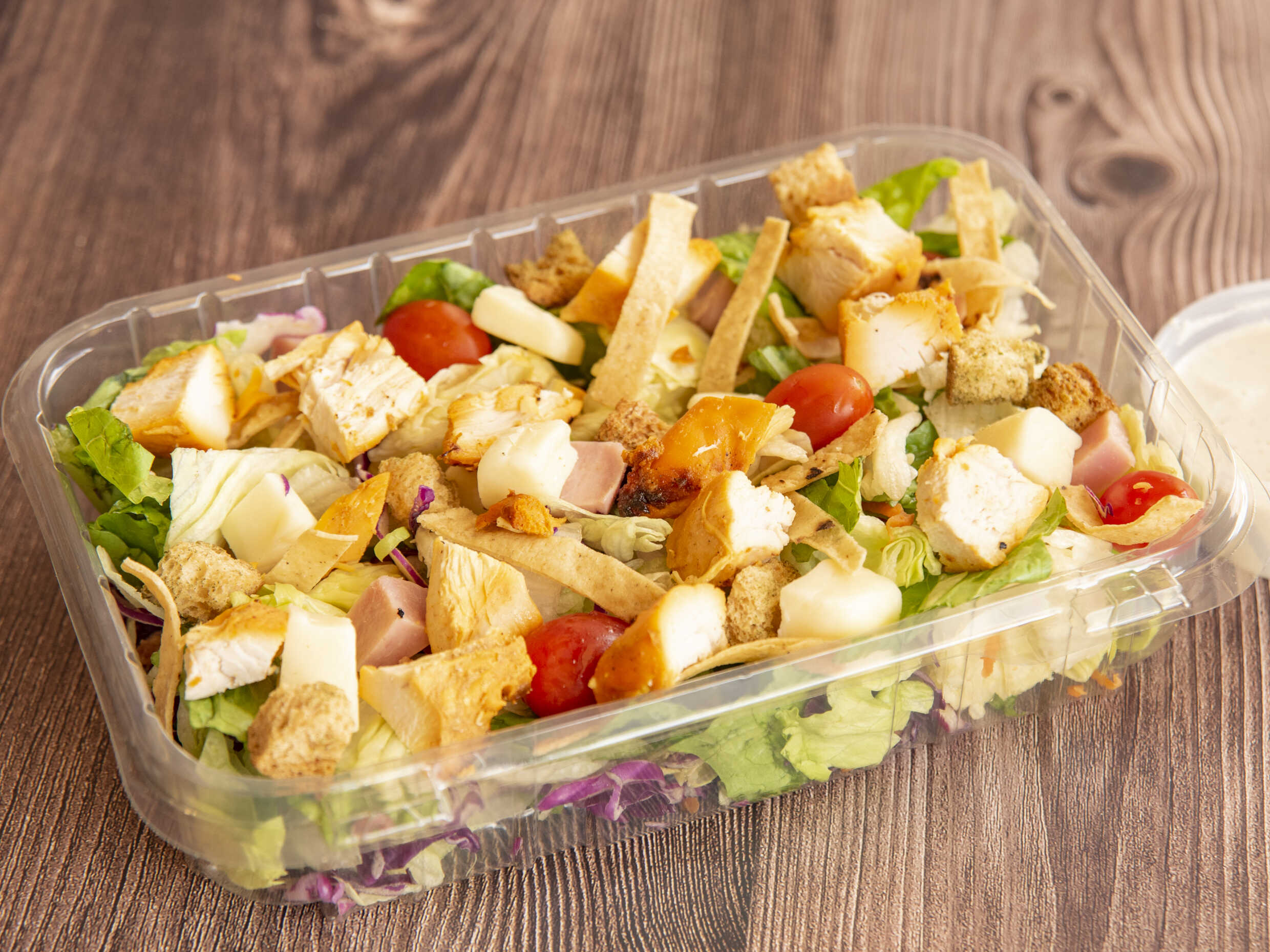 Fresca lechuga orejona y romana con jugosos trozos de pollo crispy o a la parrilla, zanahoria, col morada, jamón, tocino, queso Monterrey Jack, tiras crujientes de tortilla y croutones.