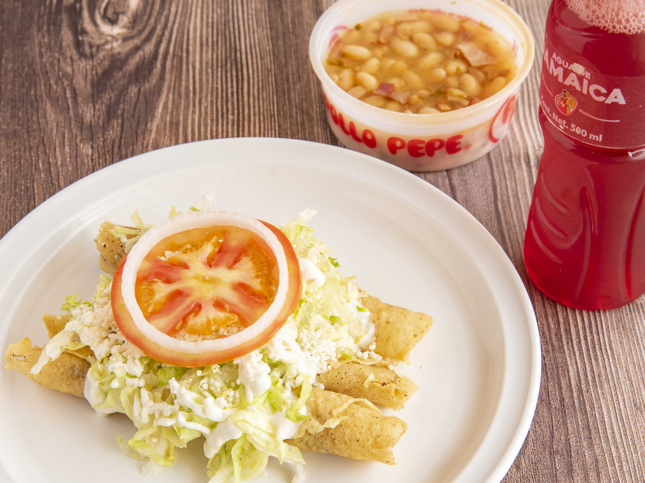 Crujientes y doraditas flautas (3) rellenas de un delicioso guisado de pollo, con lechuga y bañadas de queso y crema.