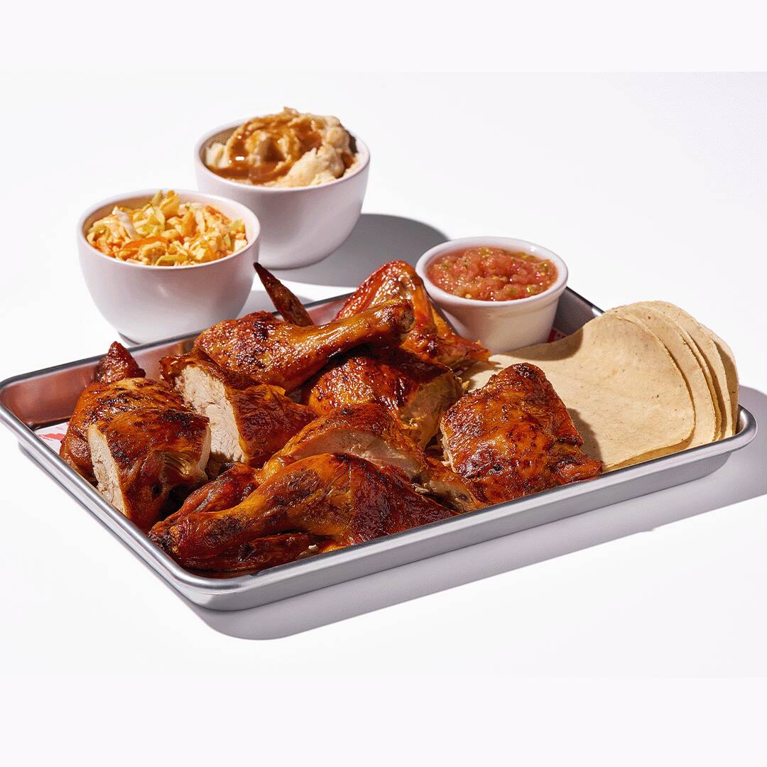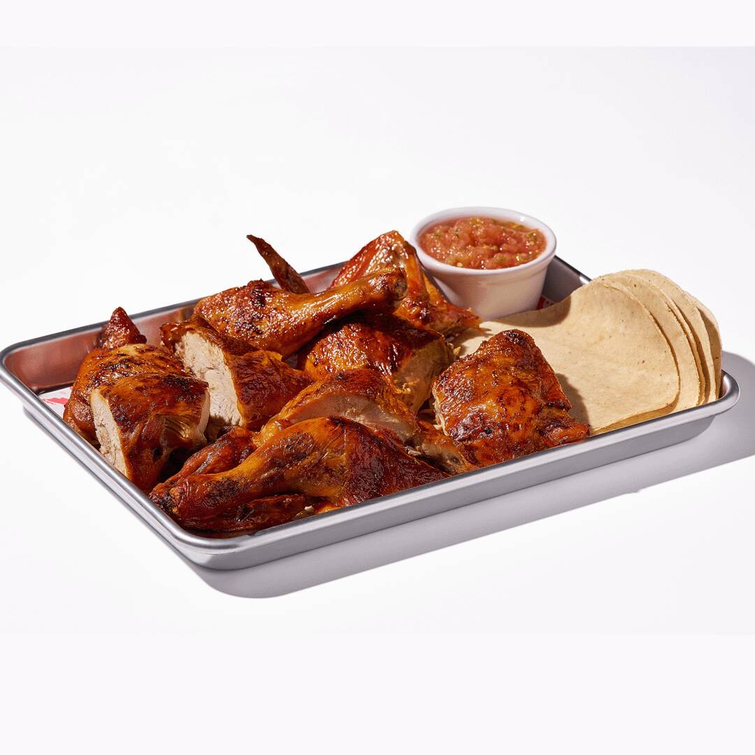 8 Piezas de pollo asado (piernas y muslos), acompañados de salsa y tortillas.