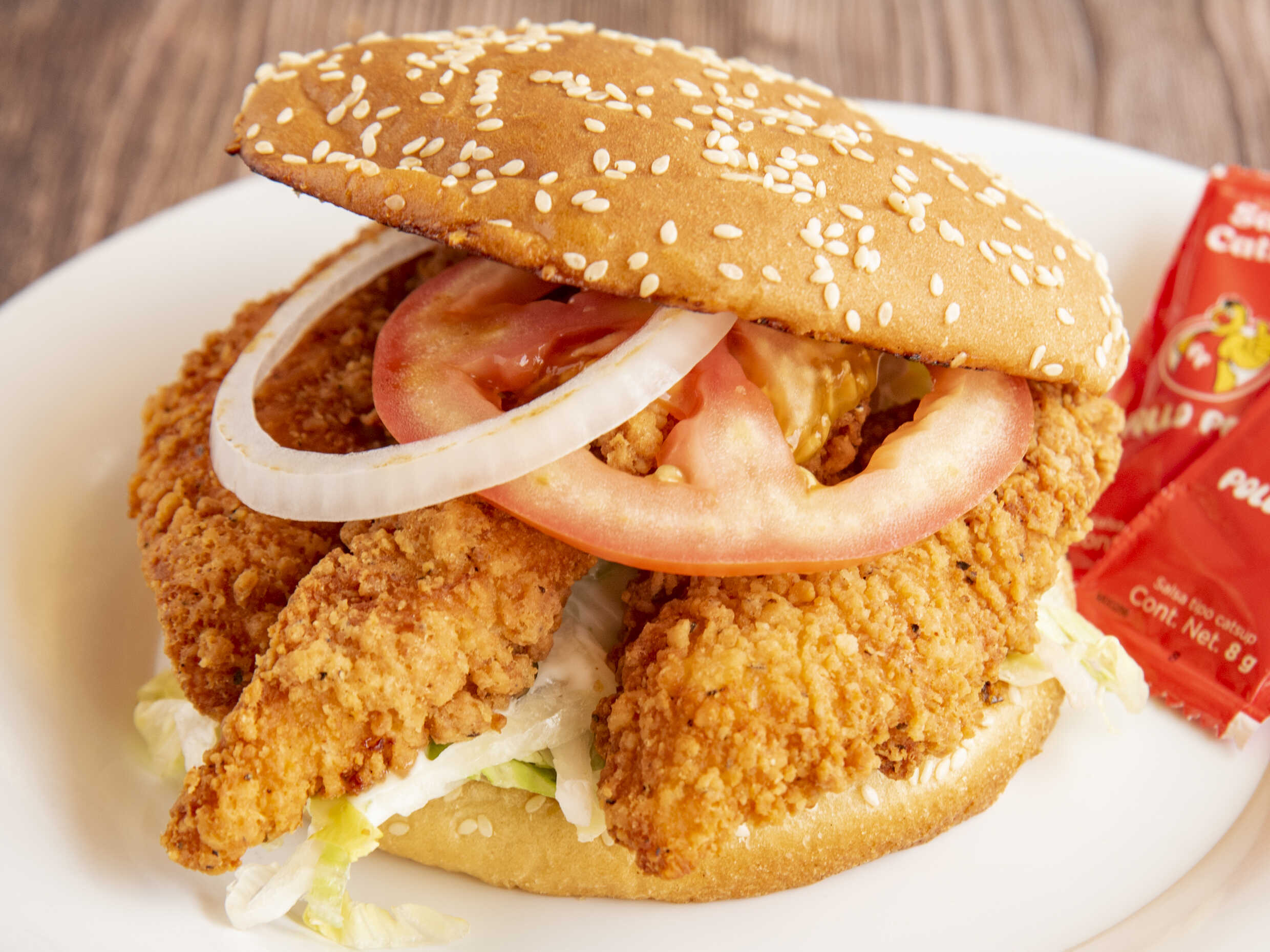 Fantástica hamburguesa de pechuga crujiente con delicioso sabor casero.