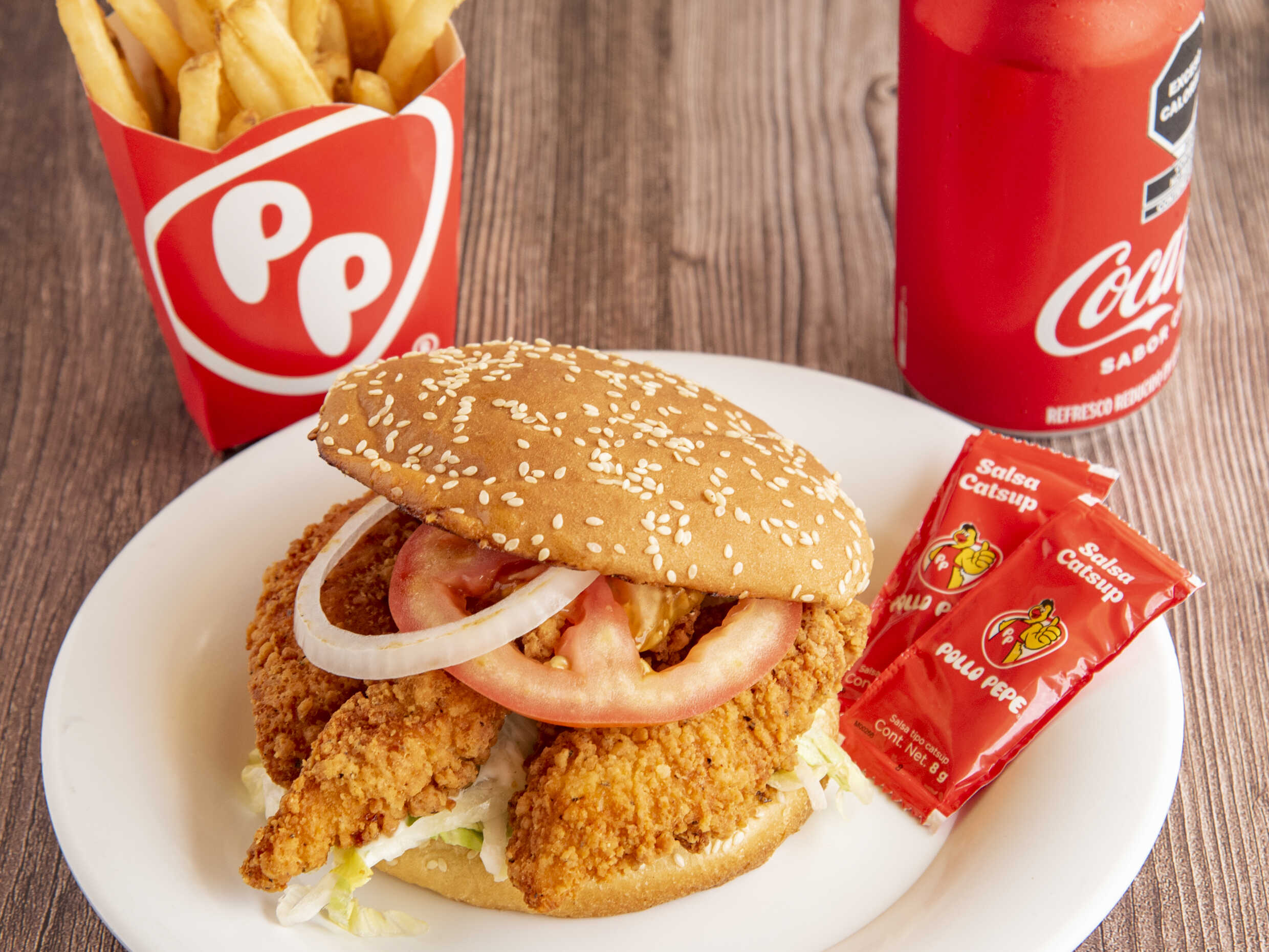 2 tiras de pechuga de pollo, crujientes, con aderezo a elegir, unas papas a la francesa chicas y bebida.