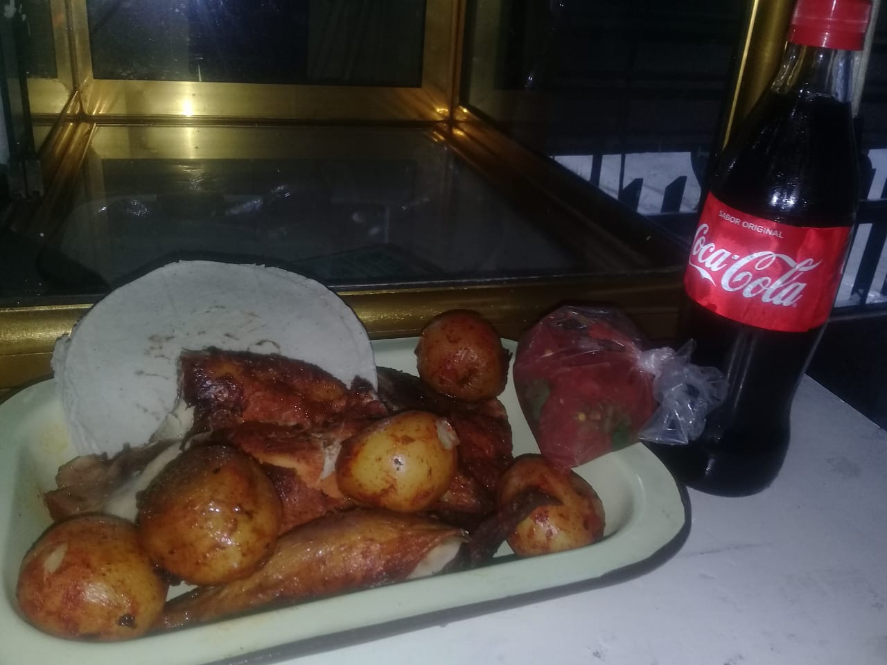 Medio pollo, refresco de 2 L.. salsa y tortillas.