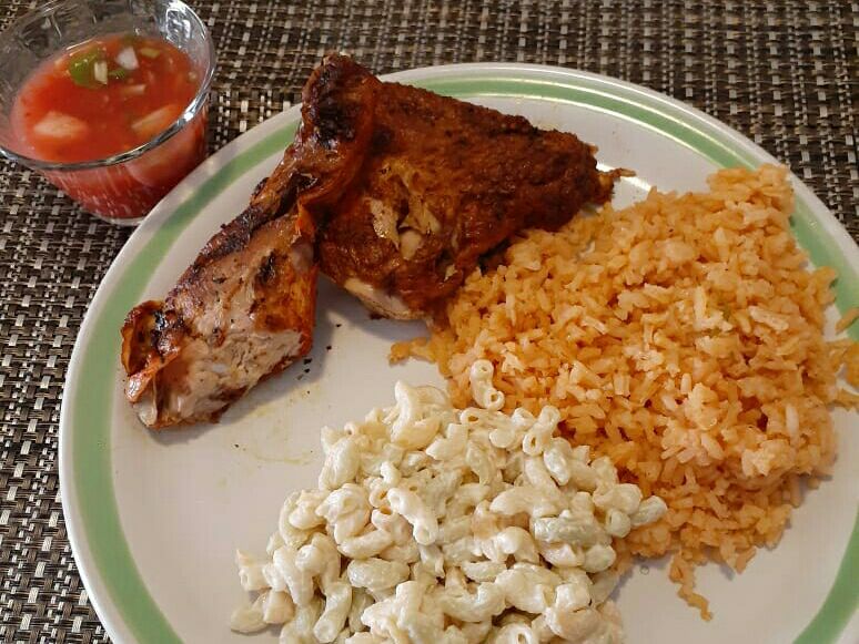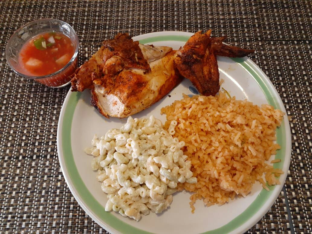 Cuarto de pollo de pechuga acompañado con arroz rojo, ensalada de coditos, tortillas y salsa.