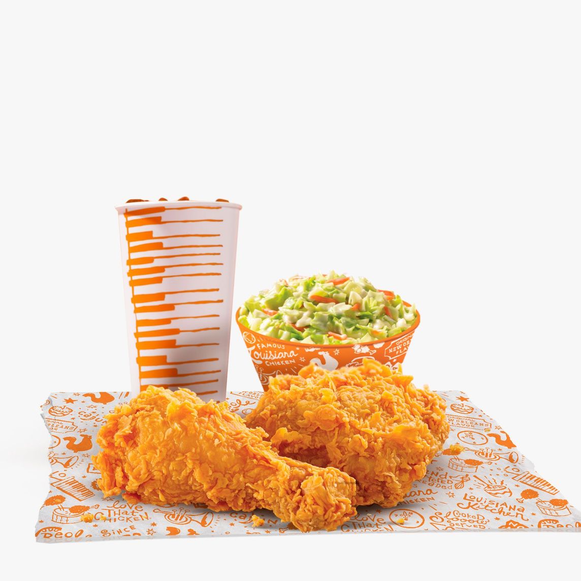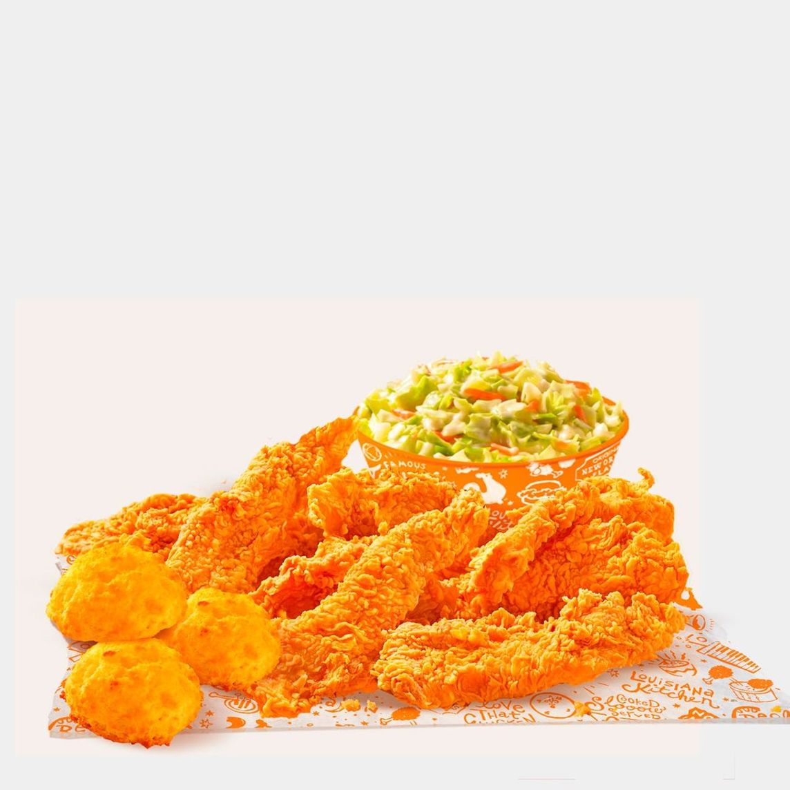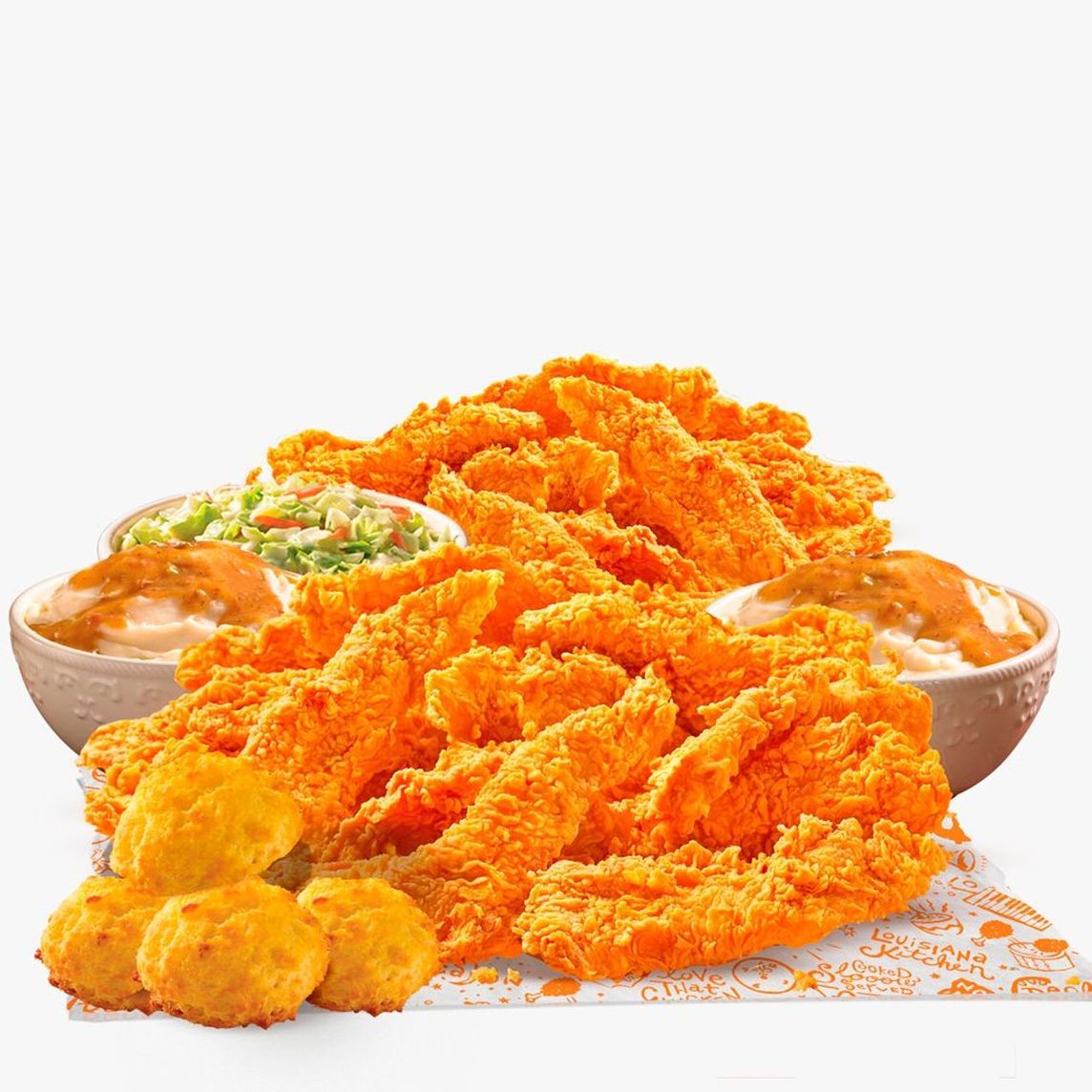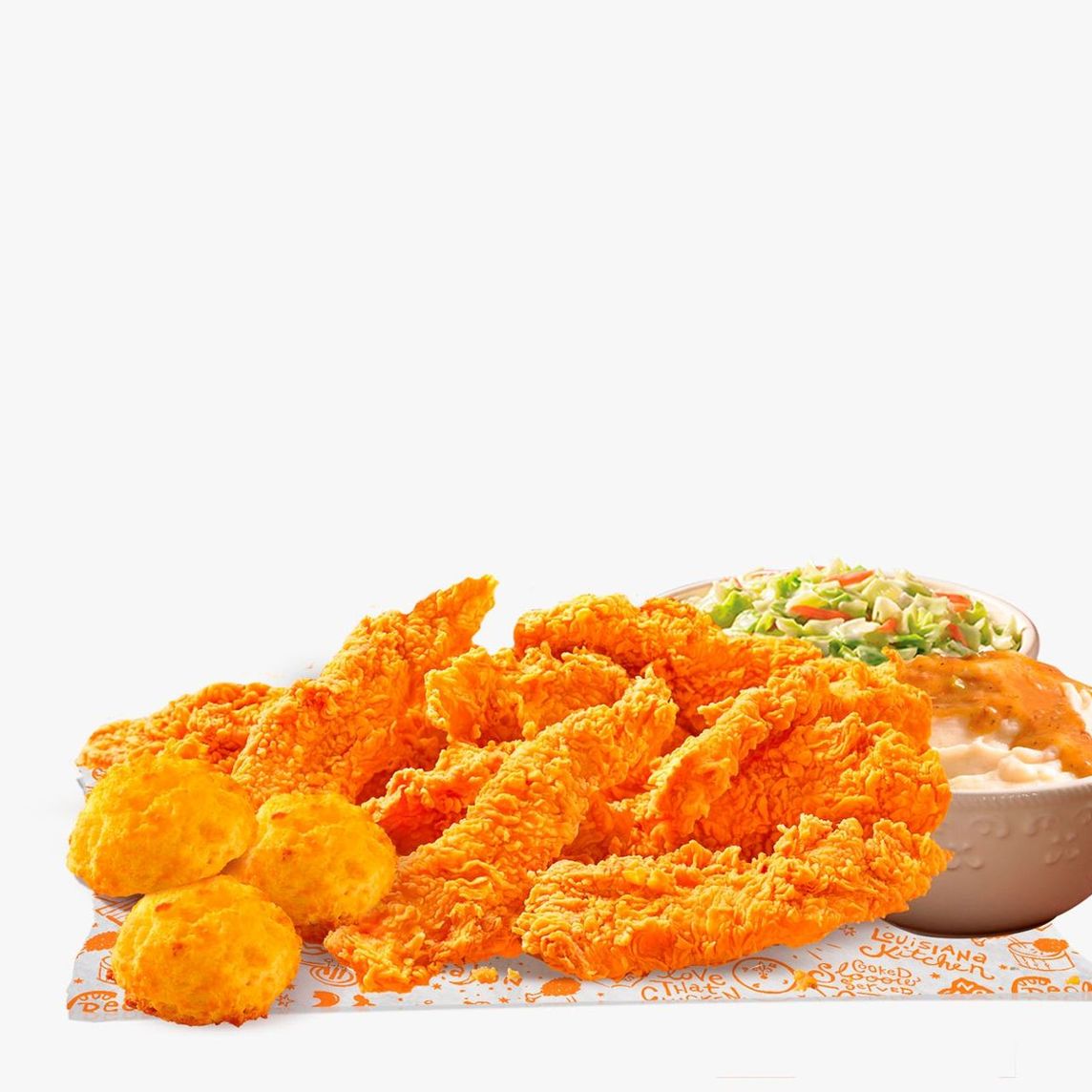 Caja Lousiana: 3 Piezas de pollo, 3 Tenders, 3 Boulettes, 1 Puré de papa regular, 1 Ensalada de col regular