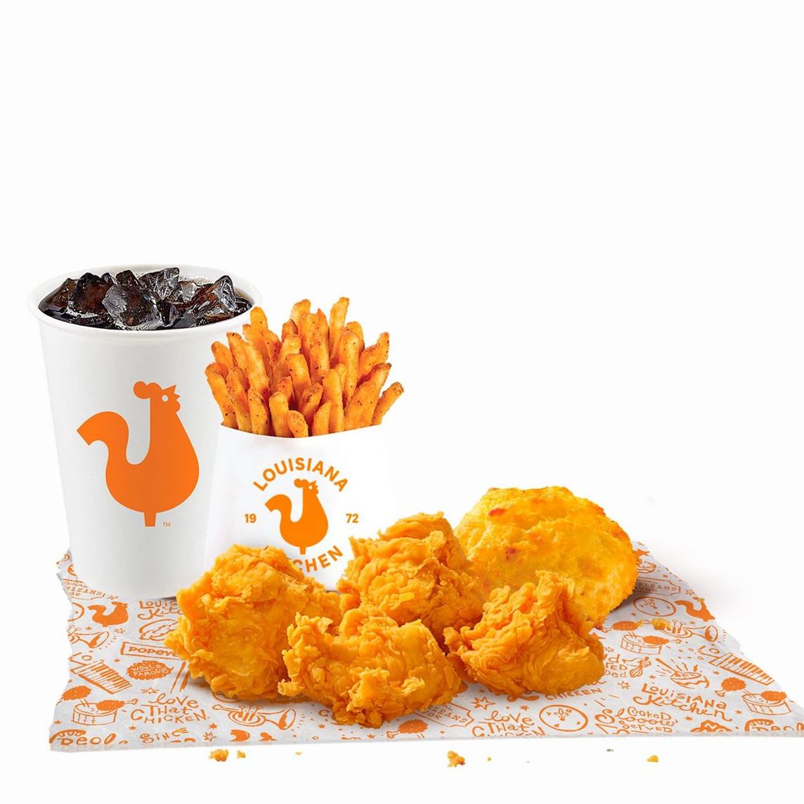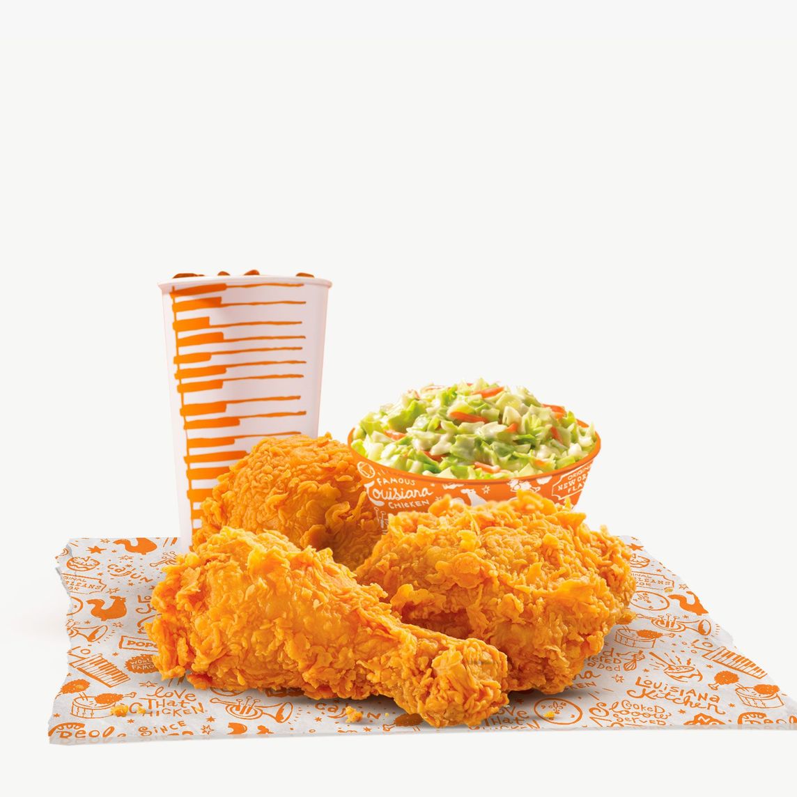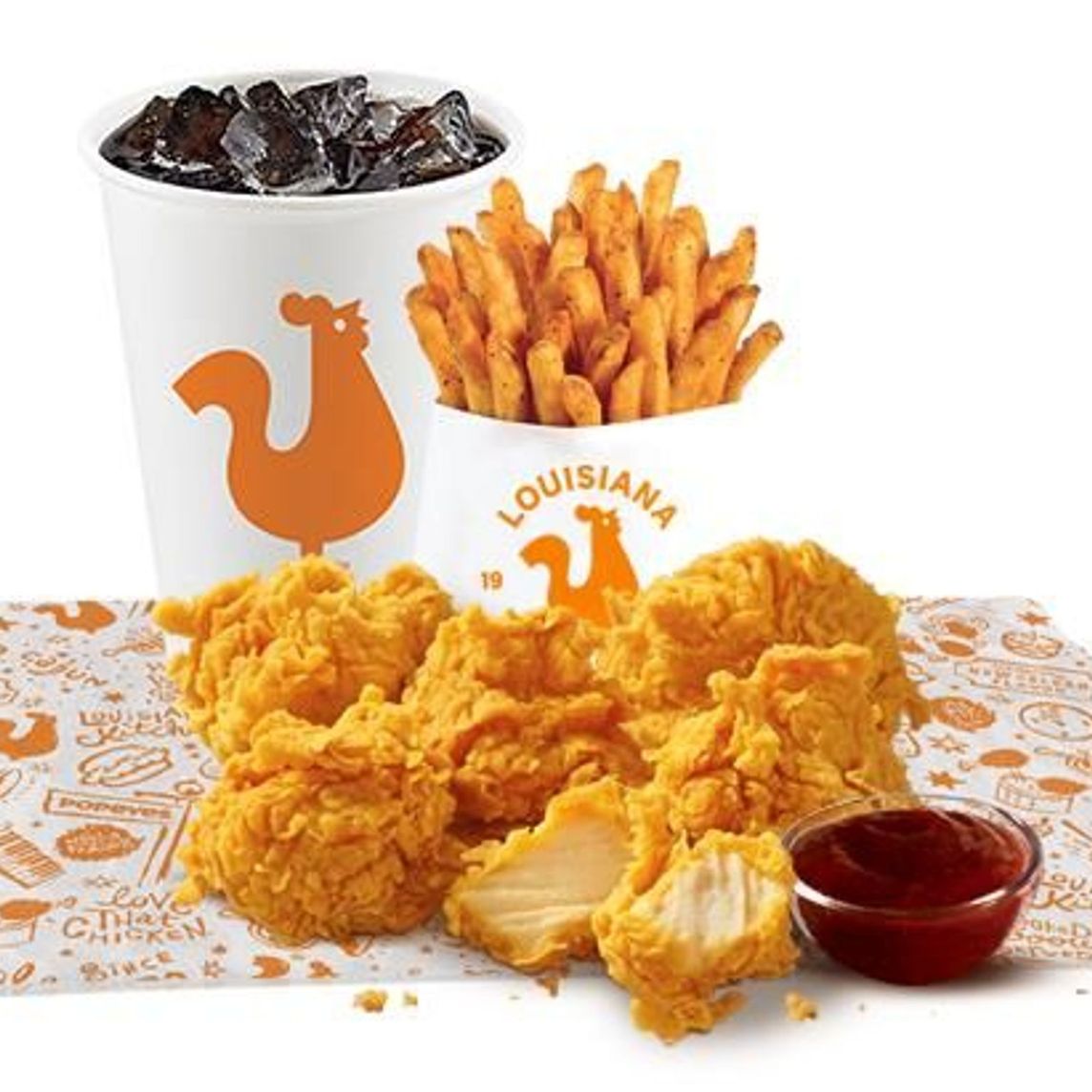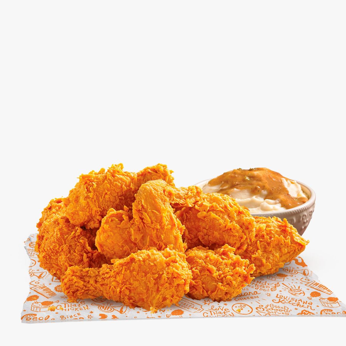 Caja Lousiana: 3 Piezas de pollo, 3 Tenders, 3 Boulettes, 1 Puré de papa regular, 1 Ensalada de col regular
