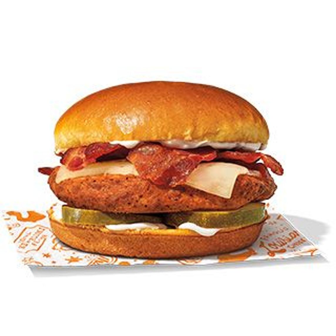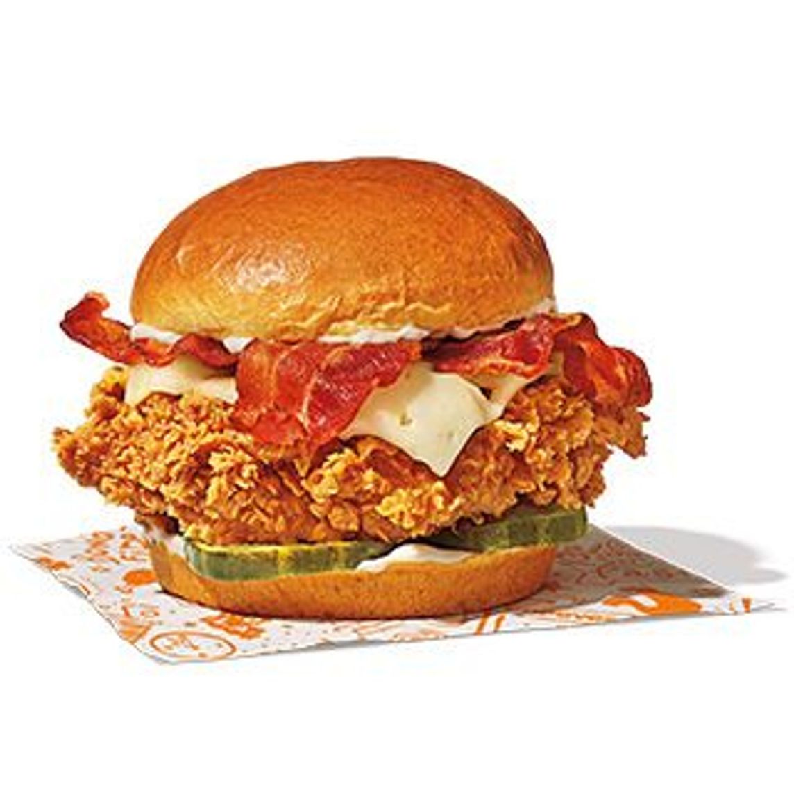Sándwich con jugosa pechuga, empanizado a mano y marinado por 12 horas, mayonesa azúl, pan brioche y auténticos pepinillos con queso y tocino.