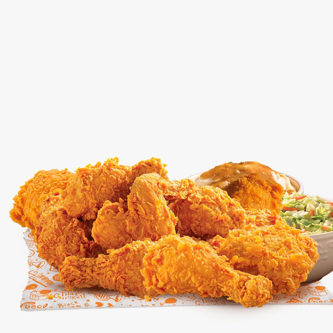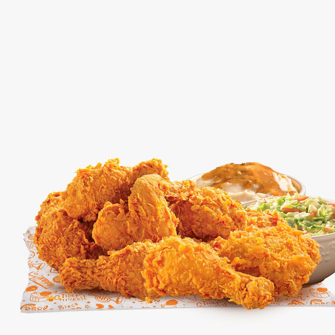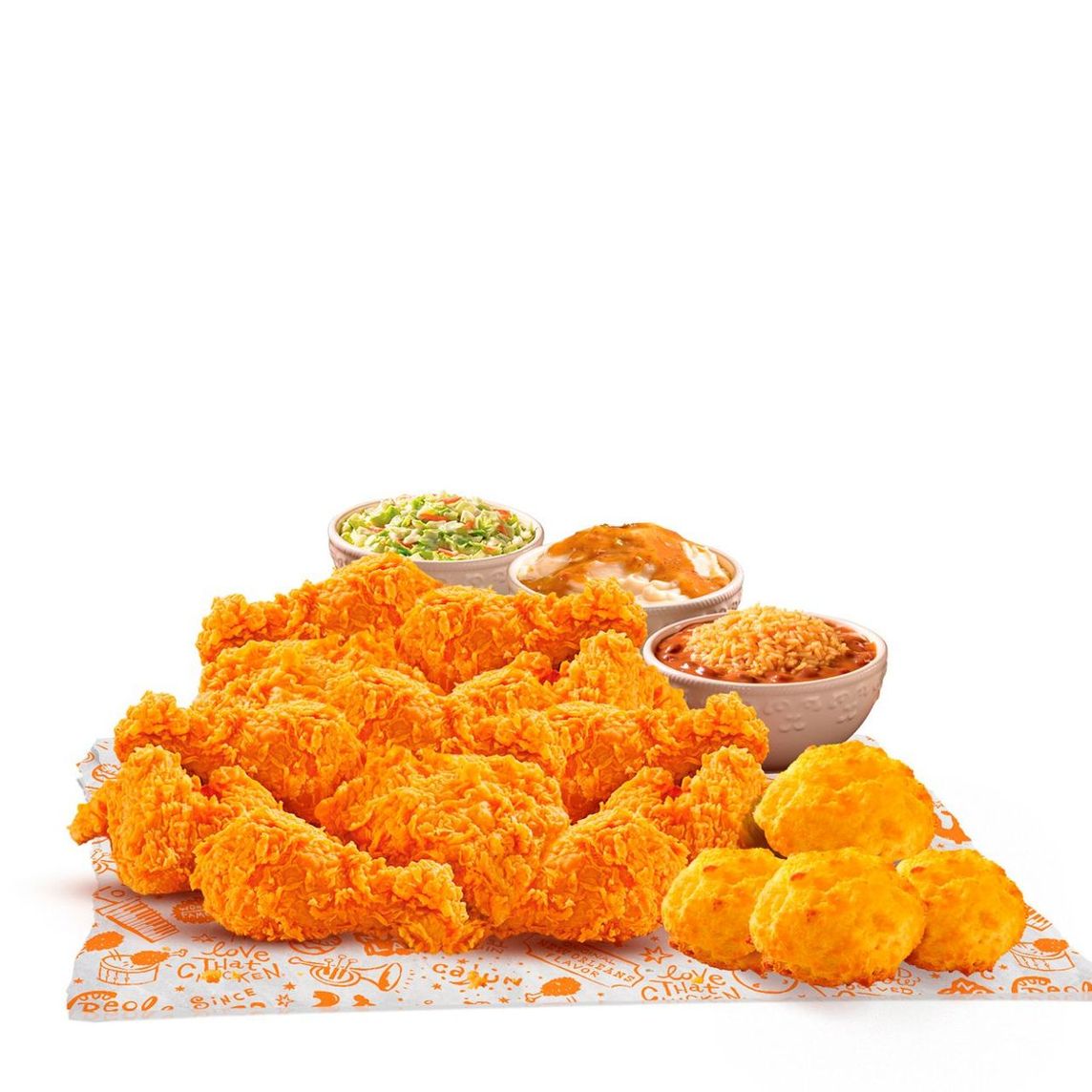 Bayou Familiar: 6 piezas de pollo, 6 Tenders, 4 Pays de manzana, 2 Ensaladas de col regular, 2 Purés de papa regular