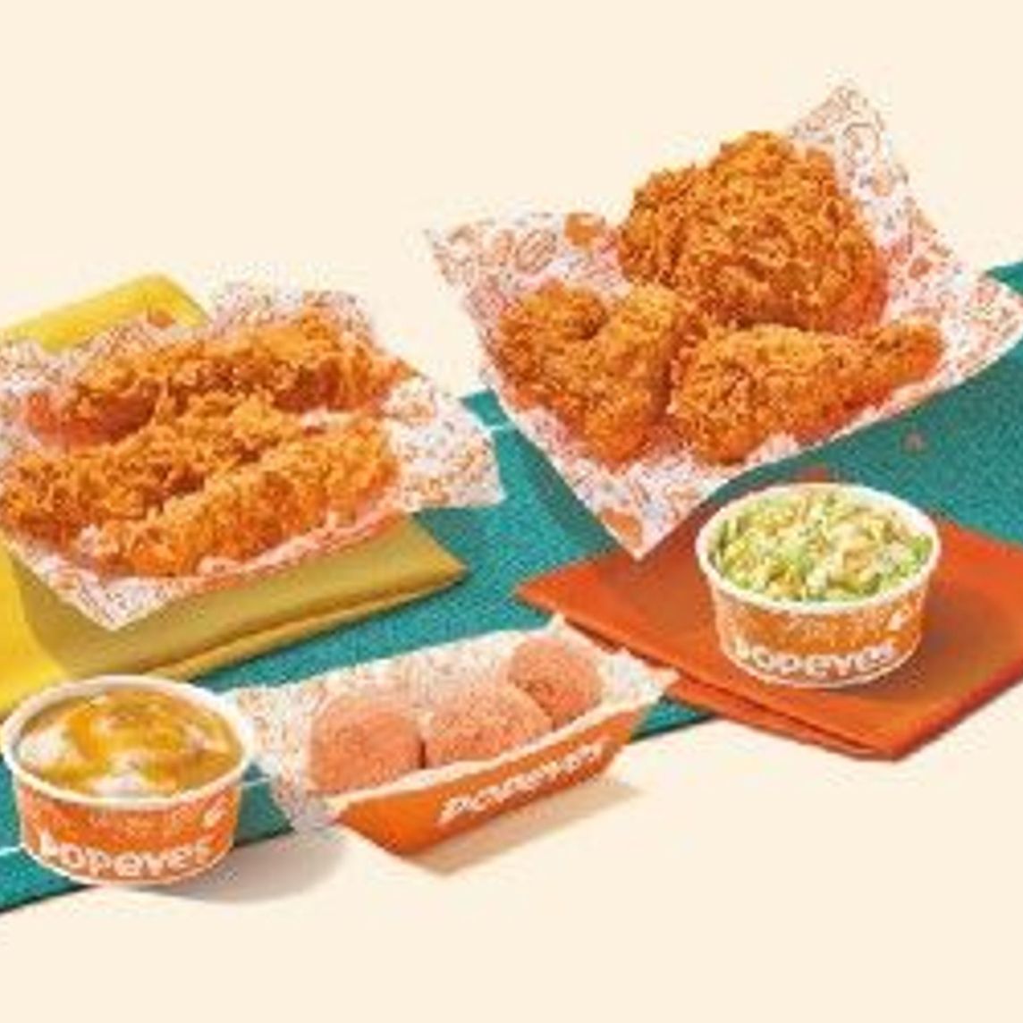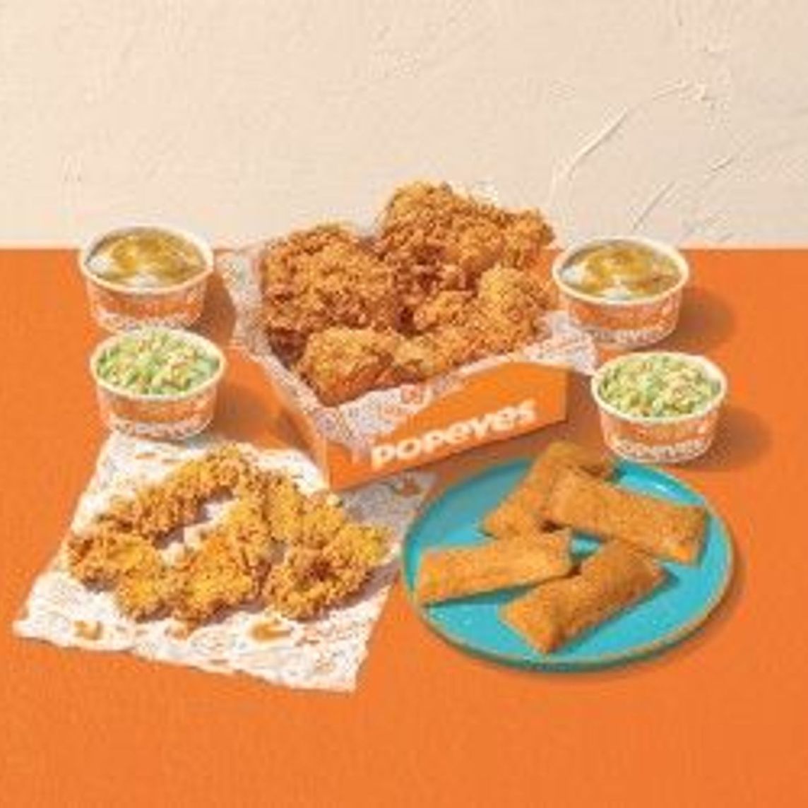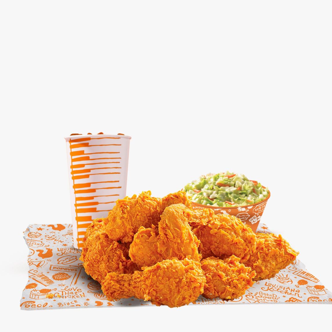 Bayou Familiar: 6 piezas de pollo, 6 Tenders, 4 Pays de manzana, 2 Ensaladas de col regular, 2 Purés de papa regular