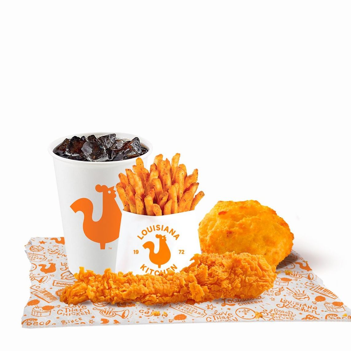 Caja Cajún: 1 Chicken sandwich clásico + 2 tenders + 1 papas cajún regular + 1 refresco