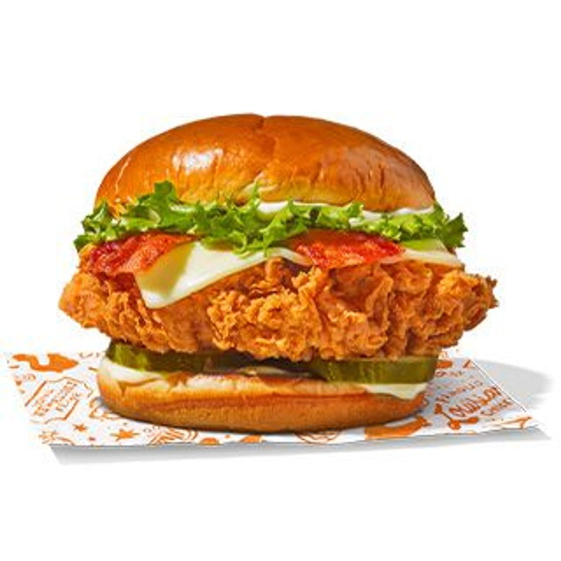 Sándwich con jugosa pechuga, empanizado a mano y marinado por 12 horas, mayonesa azúl, pan brioche con lechuga, jitomate tocino y queso.