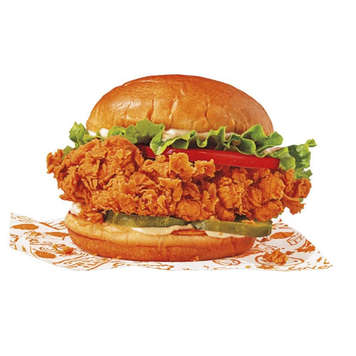 Sándwich con jugosa pechuga, empanizado a mano y marinado por 12 horas, mayonesa azúl, pan brioche con lechuga, jitomate.