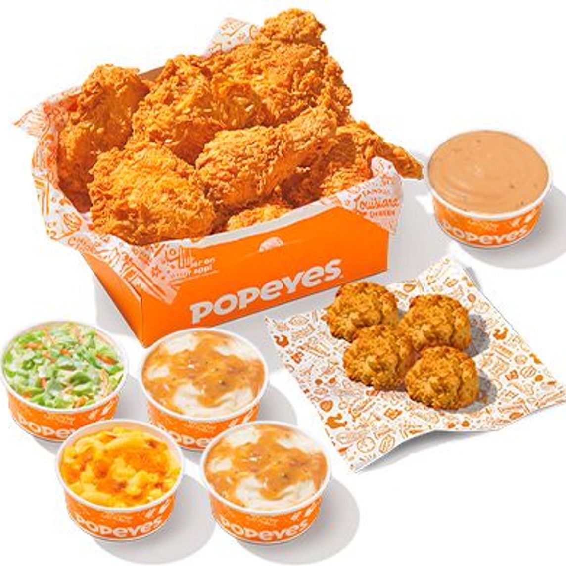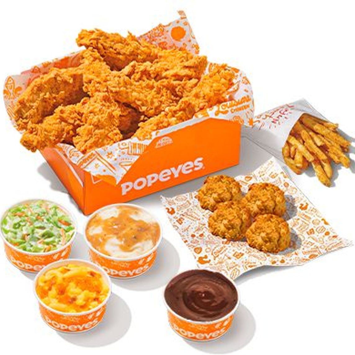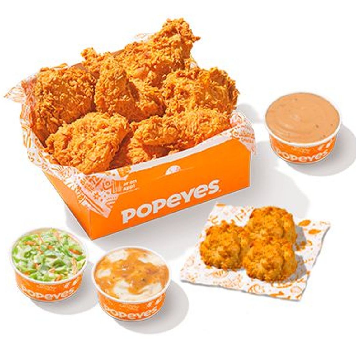 Bayou Familiar: 6 piezas de pollo, 6 Tenders, 4 Pays de manzana, 2 Ensaladas de col regular, 2 Purés de papa regular